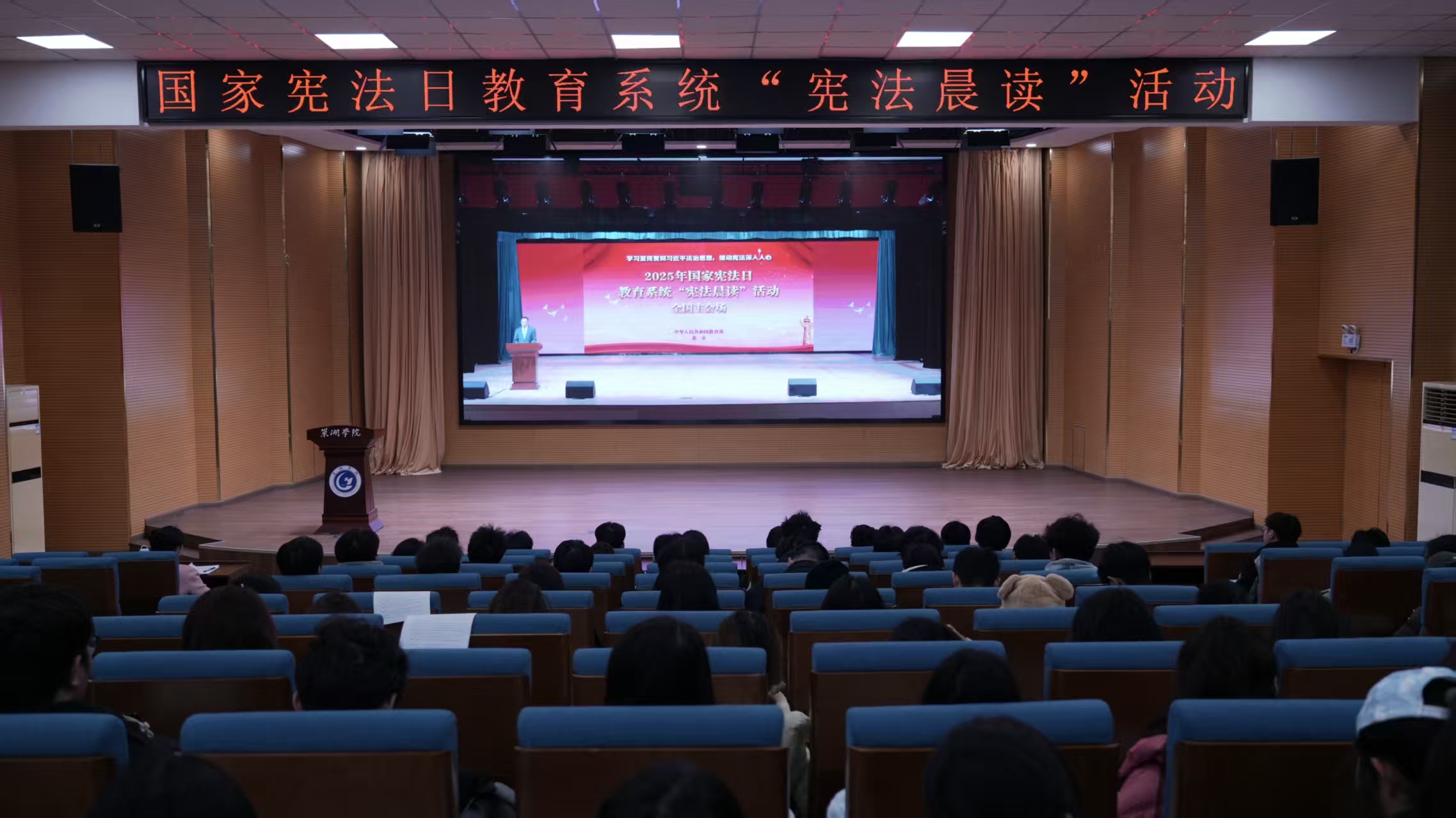 12月4日是我国第十二个国家宪法日。为弘扬宪法精神,增强师生法治意识,巢湖学院采取集中和分散相结合的方式,在学生社区、求实楼报告厅、学院会议室、教室等多个场景,组织3000余名师生观看教育部全国青少年普法网直播,开展“宪法晨读”活动。