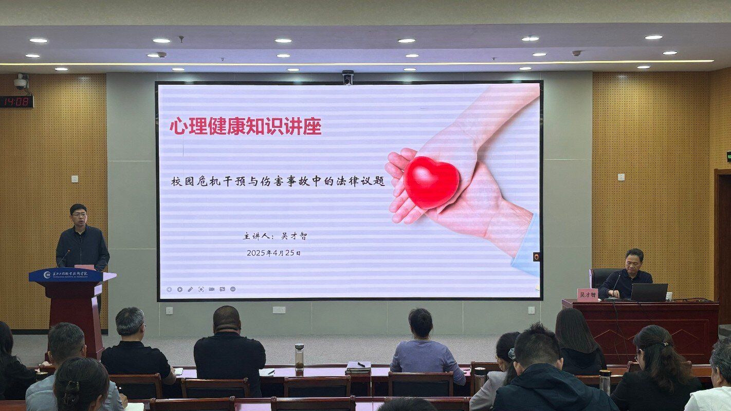 为进一步加强学生突出心理问题防治工作,帮助各级管理人员提升校园危机干预能力与应对突发事件处置效能。4月25日下午,党委学生工作部特别邀请华中师范大学心理健康教育中心吴才智教授在惟勤厅为我们作题为《校园危机干预与伤害事故中的法律议题》的心理育人专题讲座。党委学生工作部、保卫部主要负责人、各院系党总支书记及副书记、全体专兼职辅导员、心理健康教育课专兼职教师、校园宿舍管理人员共同参与。讲座由校党委委员、副校长卢俊主持。