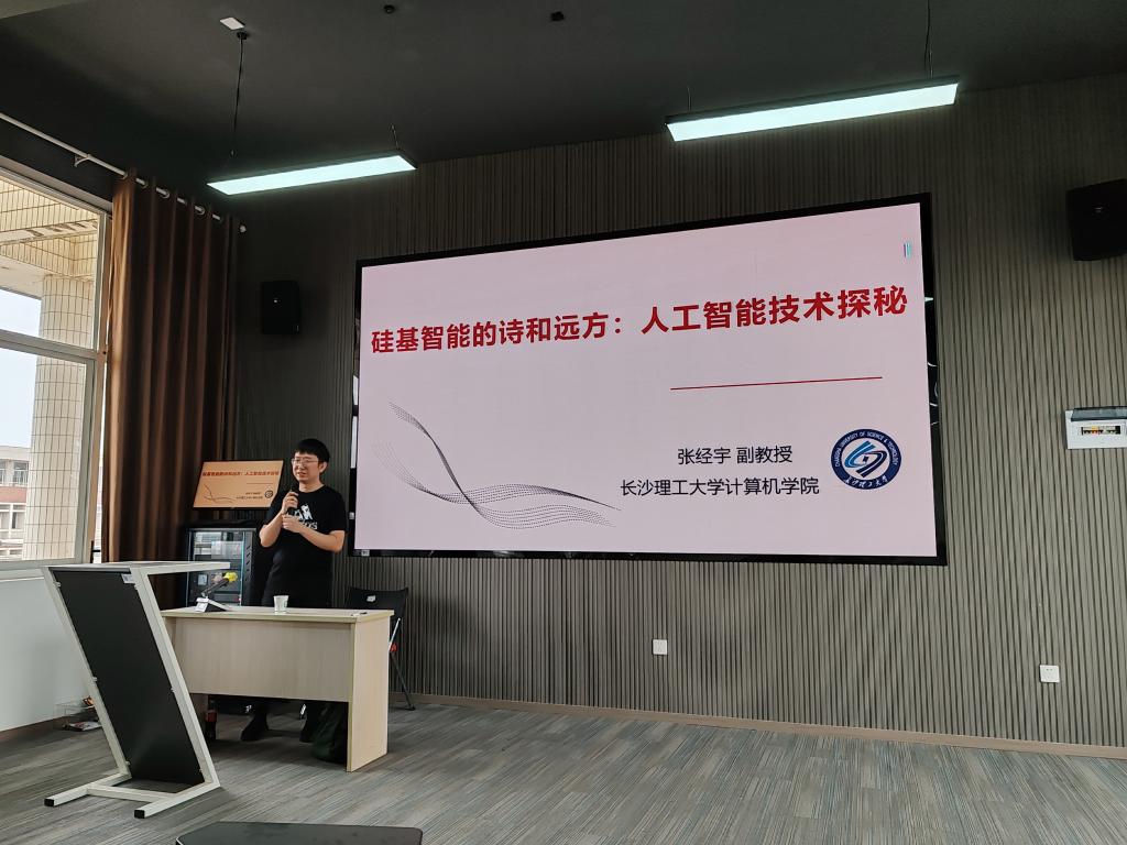 4月16日下午,长沙理工大学国际工学院通识教育讲座《硅基智能的诗和远方:人工智能技术探秘》在云塘校区文科楼D505顺利举办。本次讲座由长沙理工大学计算机学院计算机科学与技术系主任、湖南省普通高校青年骨干教师、长沙理工大学“湖湘学者”特聘副教授张经宇老师主讲。本次讲座旨在加深同学们对人工智能的理解,并结合实际生活中的案例帮助同学们进一步提升对人工智能的认识。