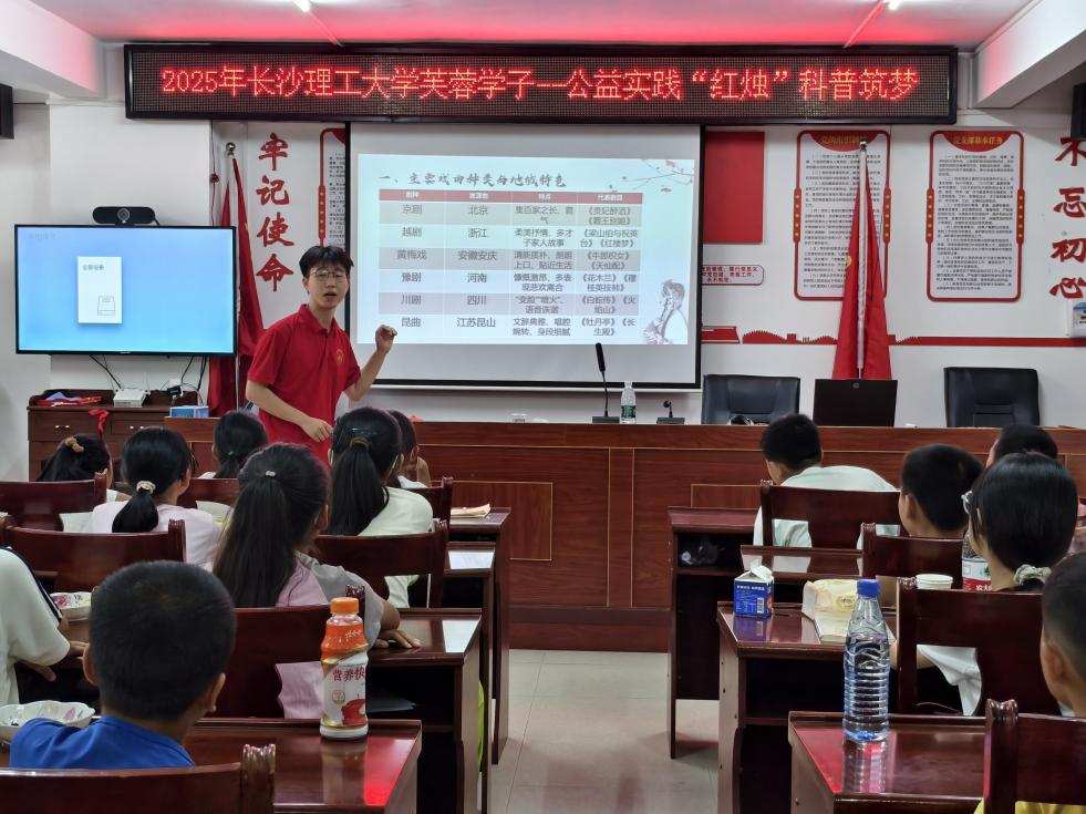7月9日,湖南省张家界市桑植县竹叶坪乡金龙村上演了一场别开生面的“梨园春韵 国粹传承”戏曲文化主题活动。长沙理工大学“红烛”科普筑梦团暨匠心传承实践团成员谷帆,创新采用“知识讲解+互动体验+动手实践”的模式,带领乡村青少年沉浸式感受非遗戏曲艺术的独特魅力。