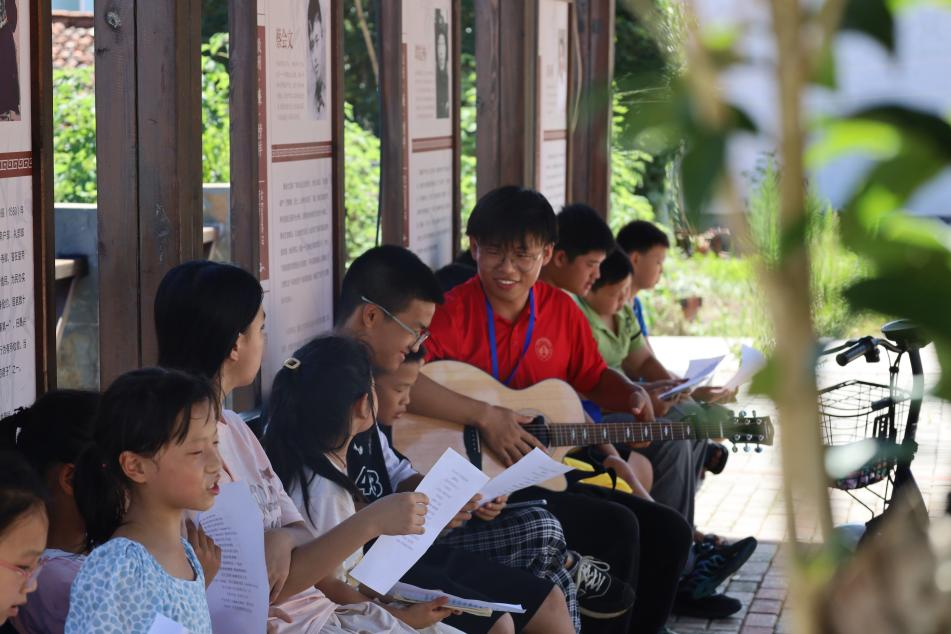 清风廊内,吉他声伴着稚嫩的歌声悠扬飘荡。音乐班的孩子在团队成员禹泓宇的带领下,化身为“小小合唱团”。他们学习乐理知识、练习发声技巧,共同演唱着精心挑选的歌曲——《夜空中最亮的星》。