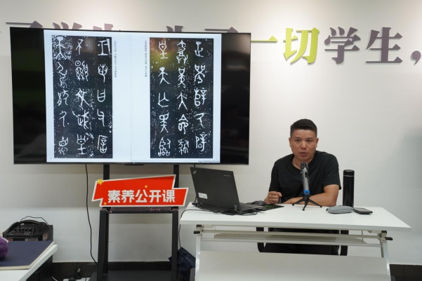 课上,邵勇以“技法传承”为骨、“文化同心”为魂,展开生动讲解。他从经典书体的临摹技巧切入,按顺序介绍了篆书、隶书、魏碑、行书、草书的笔法特点,分析各名家代表作中笔法的提按转折、结构的疏密布局,突出作品内字体的变化。他强调,“临摹不是简单复刻,而是与古人进行跨越时空的对话,是与经典达成审美共识的‘同心’过程”。谈及创作时,他结合自身作品创作经历指出,书法创作既要扎根传统沃土,更要融入时代感悟,让千年笔墨与当代精神形成“同心共振”。课后,邵勇将个人作品集赠送给老师和同学们,勉励同学们写好汉字。