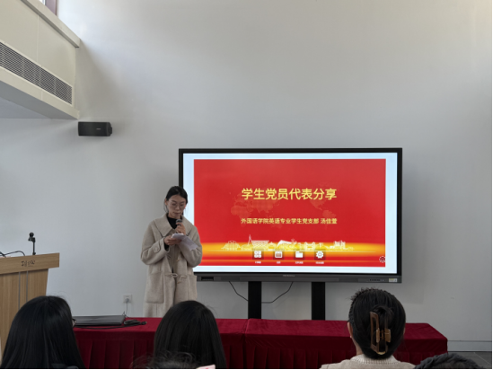 英语学生党支部汤佳萱同学从当代大学生党员的视角分享了廉洁感悟。“冯梦龙用四年任期诠释了廉政的真谛——不是空洞的口号,而是融入施政细节的坚守,是为民之心的自然流露。”她强调廉政不是被动恪守,而是“主动担当”的价值追求,引发广泛共鸣。