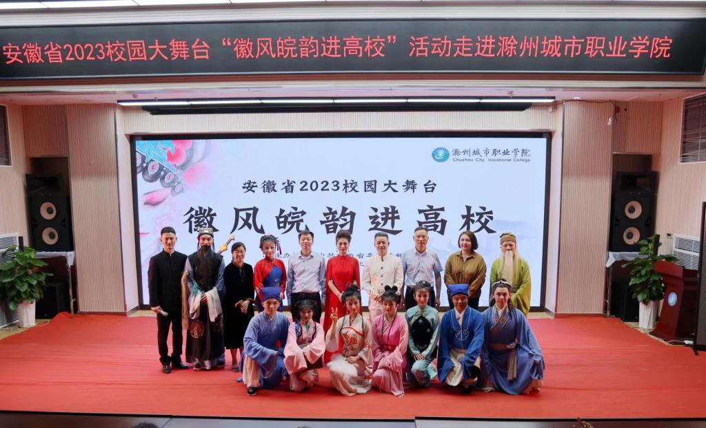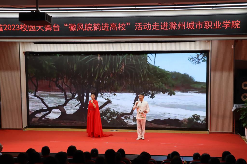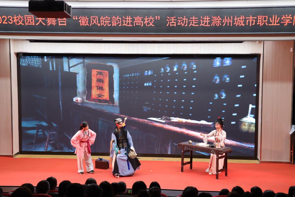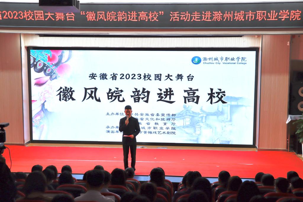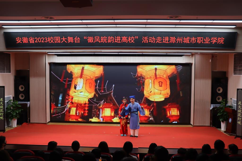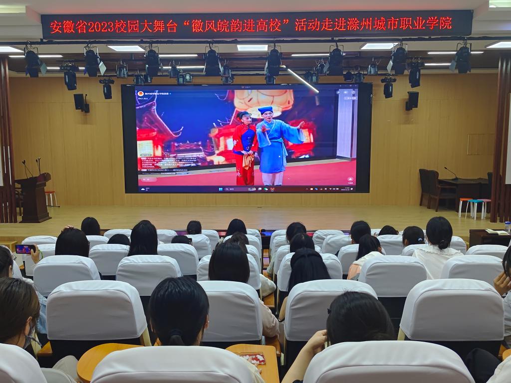 为深入贯彻落实习近平总书记关于教育和文化文艺工作的重要论述,扎实开展学习贯彻习近平新时代中国特色社会主义思想主题教育,进一步加强和改进新时代高校美育工作,全面提高我校大学生艺术修养和文化自信。5月16日下午,由省委宣传部、省教育厅、省文化和旅游厅联合主办,滁州城市职业学院承办的“徽风皖韵进高校”文化活动在我校图文中心四楼报告厅精彩上演。党委副书记、校长汪上,党委副书记牛春雨,党委委员施向阳,党委委员、纪委书记程一斌,党委委员、副校长曹士东,党委委员、学生处处长杨如江以及来自各学院的师生代表共同观看本次演出。此次活动通过网络“云端”同步直播。