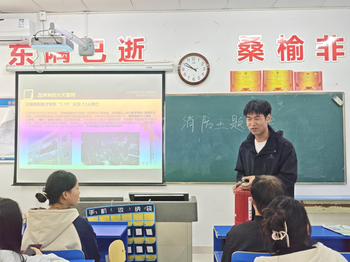 同时提醒在场的每个人,关注我们校园生活中的安全隐患,例如电线老化、漏电、汽车火灾、充电器火灾等,在这些意外发生前我们应该如何进行预防,当这些意想不到的灾难发生时,我们应如何进行自救,如何在保护自己生命的同时将损失降到最低,并由学生会副主席张梦飞同学向大家详细讲解了灭火器械、燃气报警器等消防用品的正确使用方法和注意事项。