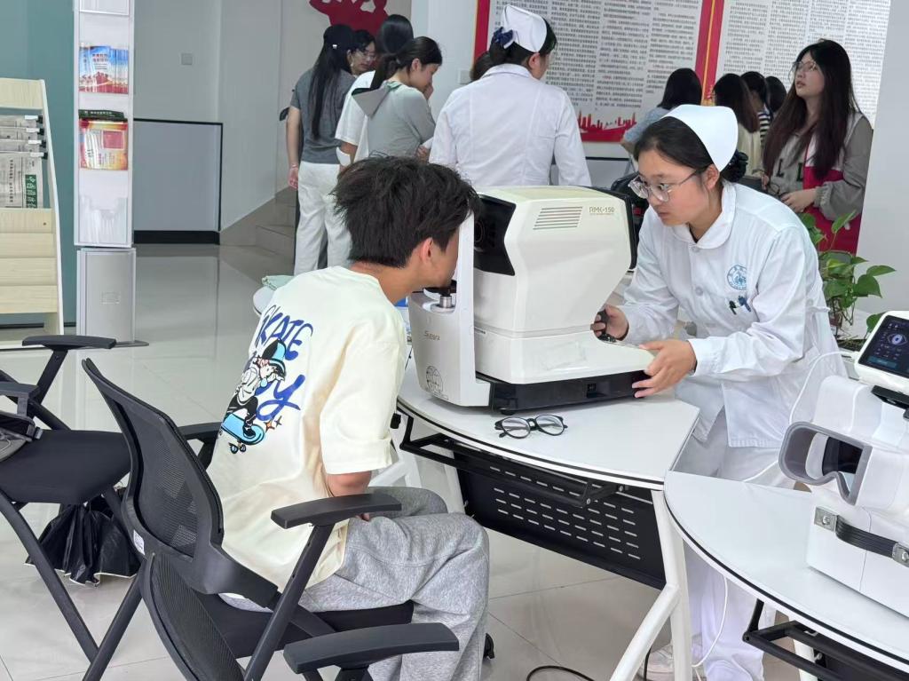 活动期间,护理学院志愿者和苏滁眼科中心医护人员相互配合,有序开展各项服务。干眼检查借助专业仪器,为受检者排查眼干、眼涩诱因;雾化熏蒸环节,轻柔雾气让眼部得到放松,缓解用眼疲劳;验光检查配镜服务,精准检测视力,为有需求的师生适配清晰“视”界;裂隙灯检查则细致筛查基础眼病,助力早发现、早干预;针对师生日常佩戴的眼镜,还提供镜架调整清洗、配件更换服务,让眼镜 “焕然一新”。