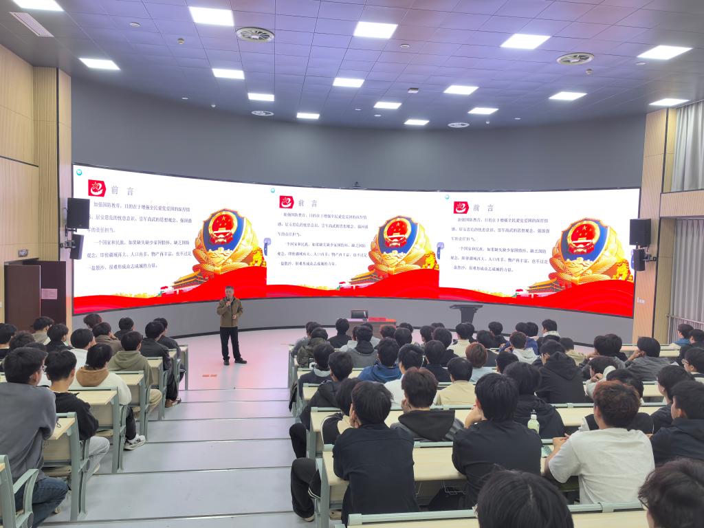 杨如江处长从“国防概述”“我们地缘概况”“周边不安全因素”“征兵政策”四大关键环节入手,进行了详细的讲解。在“优待政策” 板块,他重点介绍了学费补偿代偿、考公定向招录、退役后就业扶持等政策红利,用 “一算账、比优势” 的通俗方式,让同学们清晰了解参军对个人学业、职业发展的长远助力。