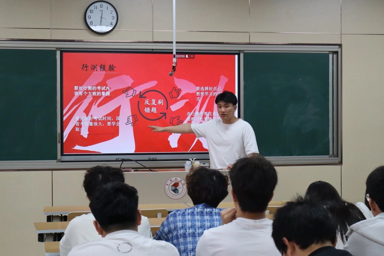 活动邀请到了21机三班王烨和21智造二班孔元彤两位优秀学生。王烨围绕考公全流程,从选岗技巧、笔试分模块复习策略,到面试流程应对与心态调整,结合实例逐一讲解,如行测各题型解题窍门、申论素材积累方法等,干货满满。孔元彤则聚焦备考规划,分科目拆解基础、强化、冲刺阶段重点,推荐实用教材与学习APP,并分享缓解备考焦虑的独家心得。