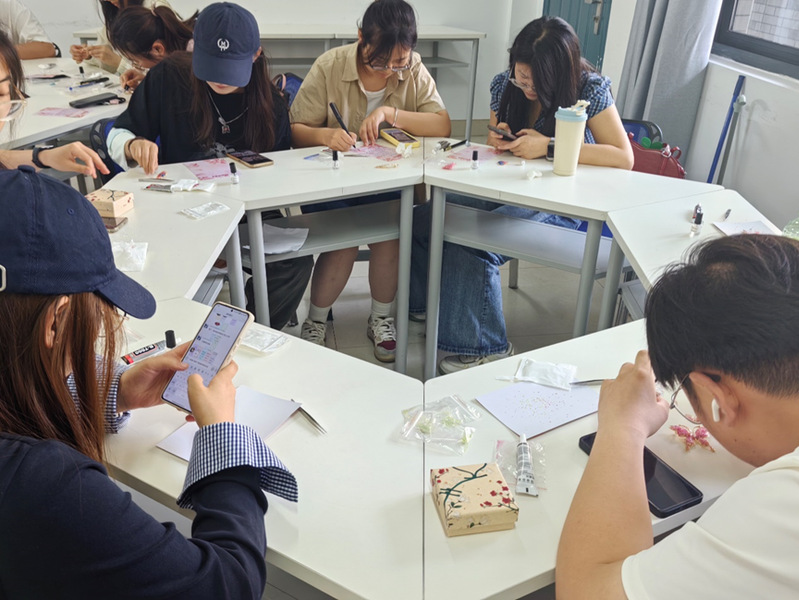 手工制作环节,同学们在专业老师的悉心指导下,全身心投入到胸针制作中。从设计独特图案,到精心镶嵌贝壳,再到反复打磨修形,每一道工序都凝聚着同学们对母亲满满的爱意与专注。制作过程中,大家积极互动,热烈交流制作技巧,在团队协作中沉浸式领略非遗技艺的独特魅力,收获了满满的成就感。完成胸针制作后,同学们还认真书写书信,在母亲节来临之际,用真挚的文字向远方的母亲诉说感恩之情。