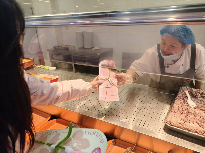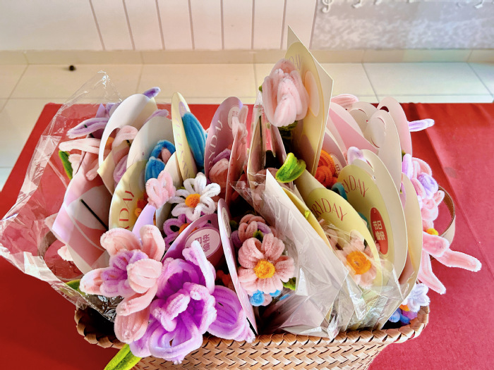在“指尖生花DIY”环节,同学们有序领取扭扭棒制作工具,跟随视频教程自由创作。大家发挥巧思、动手实践,一根根色彩缤纷的扭扭棒在指尖缠绕、弯折、塑形,化作一朵朵灵动别致的手工花。现场还准备了精美贺卡,同学们认真写下真挚祝福与暖心落款,将亲手制作的花束与贺卡精心搭配,赠予我校女性职工。