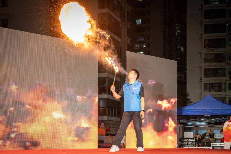 演出在25空乘331班朱孟杰的非遗喷火表演中拉开帷幕。为了呈现最佳效果,朱孟杰利用课余时间练习,从火焰控制到动作衔接,每一个细节都反复打磨。舞台上,他手持火把灵活舞动,喷出的火柱与光影交织,惊险又壮观。