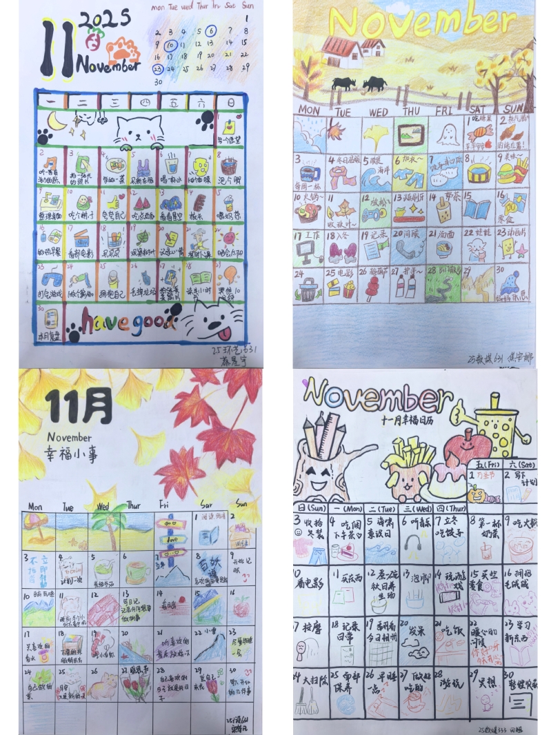 活动中,大家拿起彩笔认真勾勒着心中的幸福场景:有的同学用可爱的卡通形象画出与朋友分享零食的画面,有的同学用细腻的线条描绘出校园里的小河流,还有的同学用工整的字迹写下“每周坚持运动三次,让自己保持活力”的约定。不少同学表示,在设计日历的过程中,自己第一次认真思考“什么是幸福”,发现原来幸福并非遥不可及,而是藏在每天的小计划、小期待里。