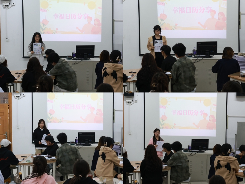 “幸福日历分享会”环节邀请部分同学展示自己的作品,讲述日历背后的幸福期待。李同学分享道:“我在日历上画了周末和妈妈一起散步的场景。以前总嫌妈妈烦,饭后非要拉着我去散步,我经常拒绝她。离开家才发现,和妈妈一起边散步边聊天就是最简单的幸福。”