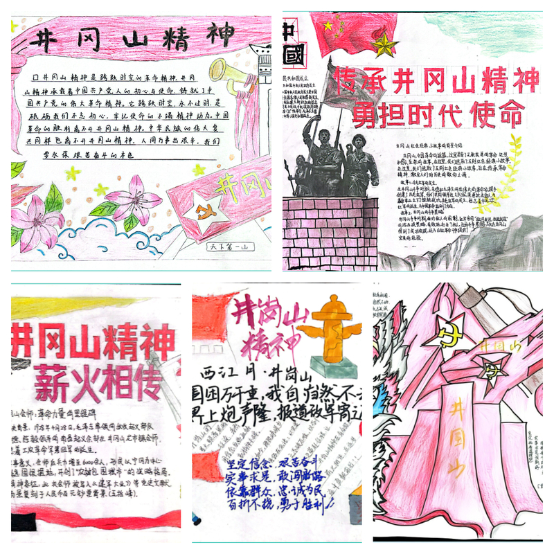 实践团成员在“一站式”学生社区活动室组织手抄报创作。同学们以井冈山斗争历史为背景,用画笔勾勒红色印记。手抄报设计主题鲜明,既有“井冈山精神”“天下第一山”等艺术字标题,也融入了号角、红旗、五角星等象征元素,并配文阐释井冈山精神“坚定信念、艰苦奋斗、依靠群众、勇于胜利”的核心要义。一名成员在创作中表示:“通过手绘,我更加体会到革命先辈在艰苦岁月中百折不挠的意志。”