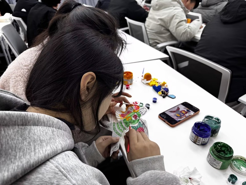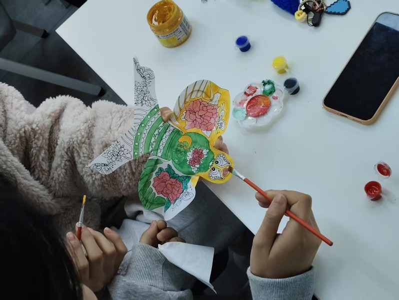 手绘风筝环节是本次活动的亮点之一。同学们、关工委老教师与教职工子女围坐在一起,携手创作、其乐融融。大家以素鸢为纸、以彩笔为媒,将国风元素、青春寄语、家庭温情、美好愿景等一一绘于风筝之上。一只只创意十足、色彩斑斓的风筝在大家手中逐渐成形,每一笔都饱含心意,每一幅作品都承载着美好期盼。