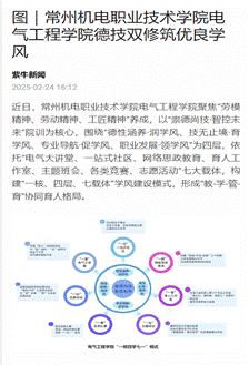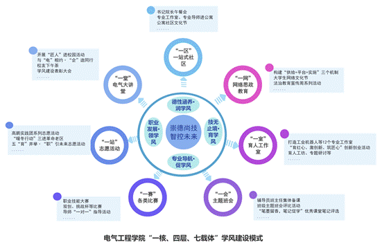 常州机电职业技术学院电气工程学院聚焦“劳模精神、劳动精神、工匠精神”养成,以“崇德尚技·智控未来”院训为核心,围绕“德性涵养·润学风、技无止境·育学风、专业导航·促学风、职业发展·领学风”四层,依托“电气大讲堂、一站式社区、网络思政教育、育人工作室、主题班会、各类竞赛、志愿活动”七大载体,构建“一核、四层、七载体”学风建设模式,聚合各方育人力量,创造良好的学习环境、营造浓厚学习氛围、养成自律自强意识,构建学风建设长效工作机制。