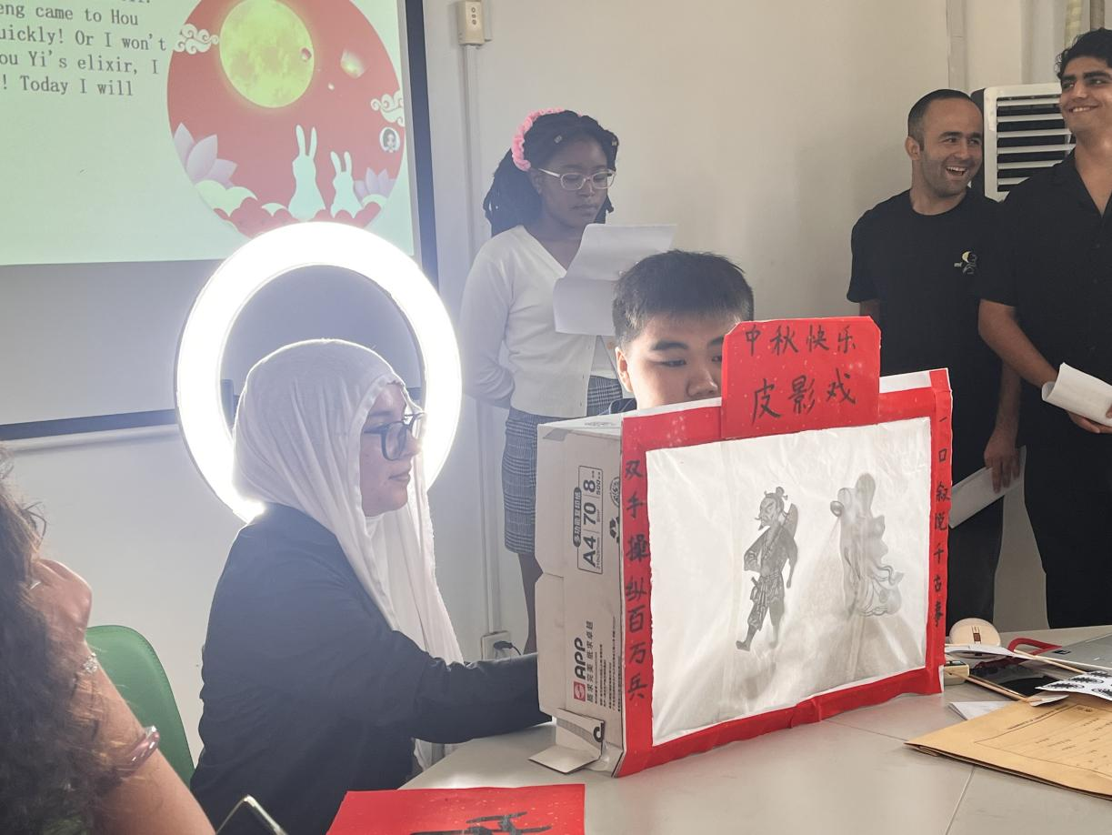 非遗皮影戏环节成为整场活动的“高光时刻”。三尺白色幕布前,一盏暖灯点亮,留学生与中国同学组成的“临时剧组”,共同演绎经典神话《嫦娥奔月》。表演结束后,留学生们纷纷涌到幕布后方,好奇地拿起皮影道具,在老师的指导下尝试操纵。来自突尼斯的妲美丽体验后,对皮影戏的匠心技艺赞叹不已,深刻体会到“一口叙说千古事,双手舞动百万兵”的非遗魅力。