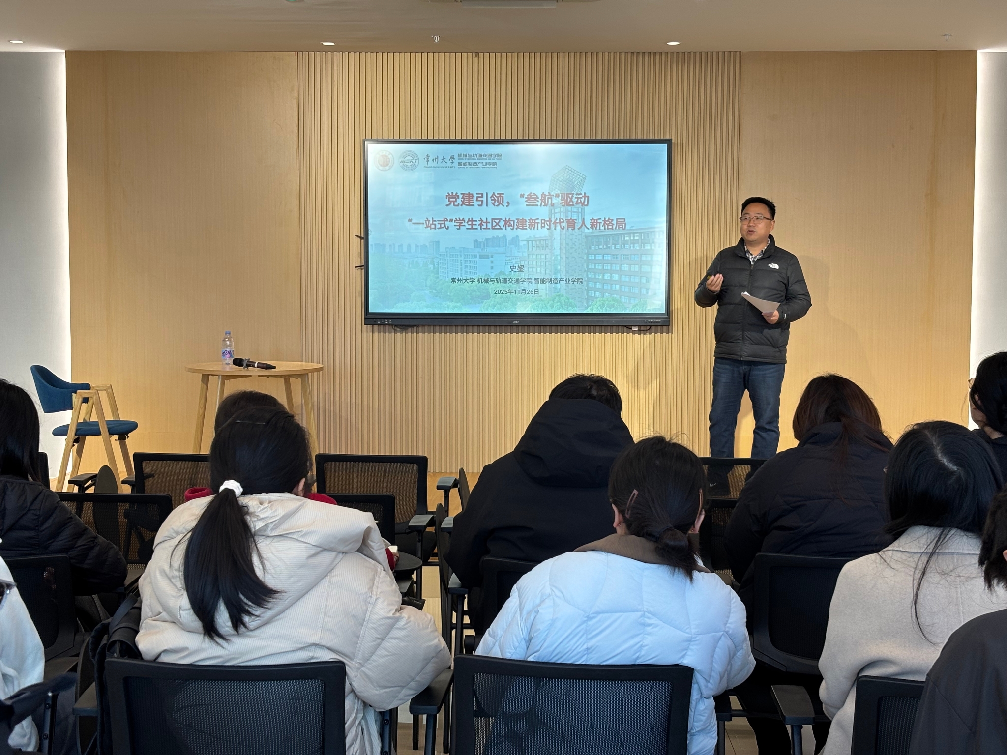 11月26日,我校第二十七期“辅导员增能计划”工作坊在武进校区丰登楼四楼知行馆举行。本次工作坊以《党建引领,“叁航”驱动—“一站式”学生社区构建新时代育人新格局》为主题,常州大学机械与轨道交通学院党委副书记史鋆担任主讲。模具技术学院党总支副书记汪小义主持活动,学校全体专职辅导员、班主任及学工处相关人员参与培训。