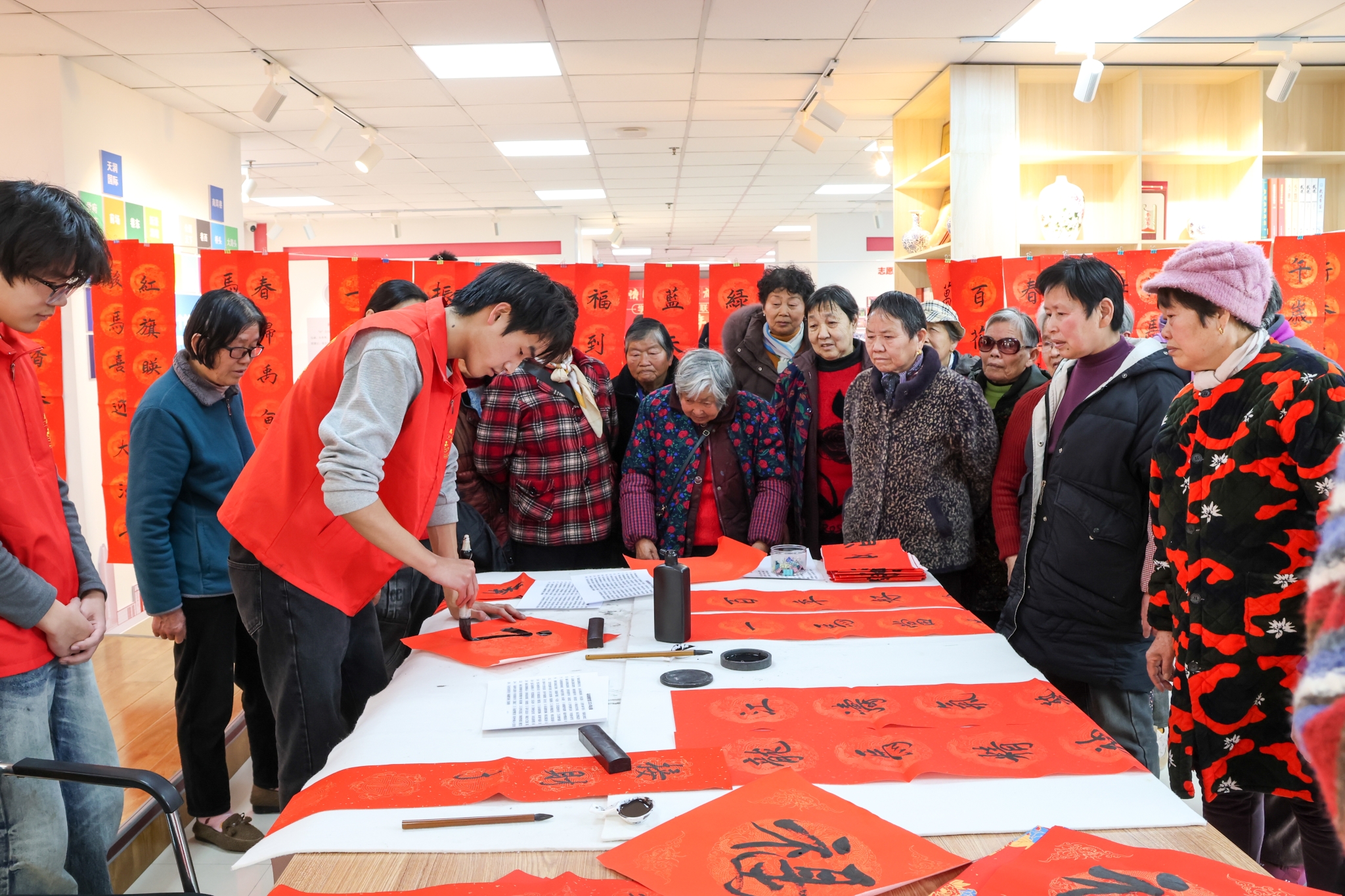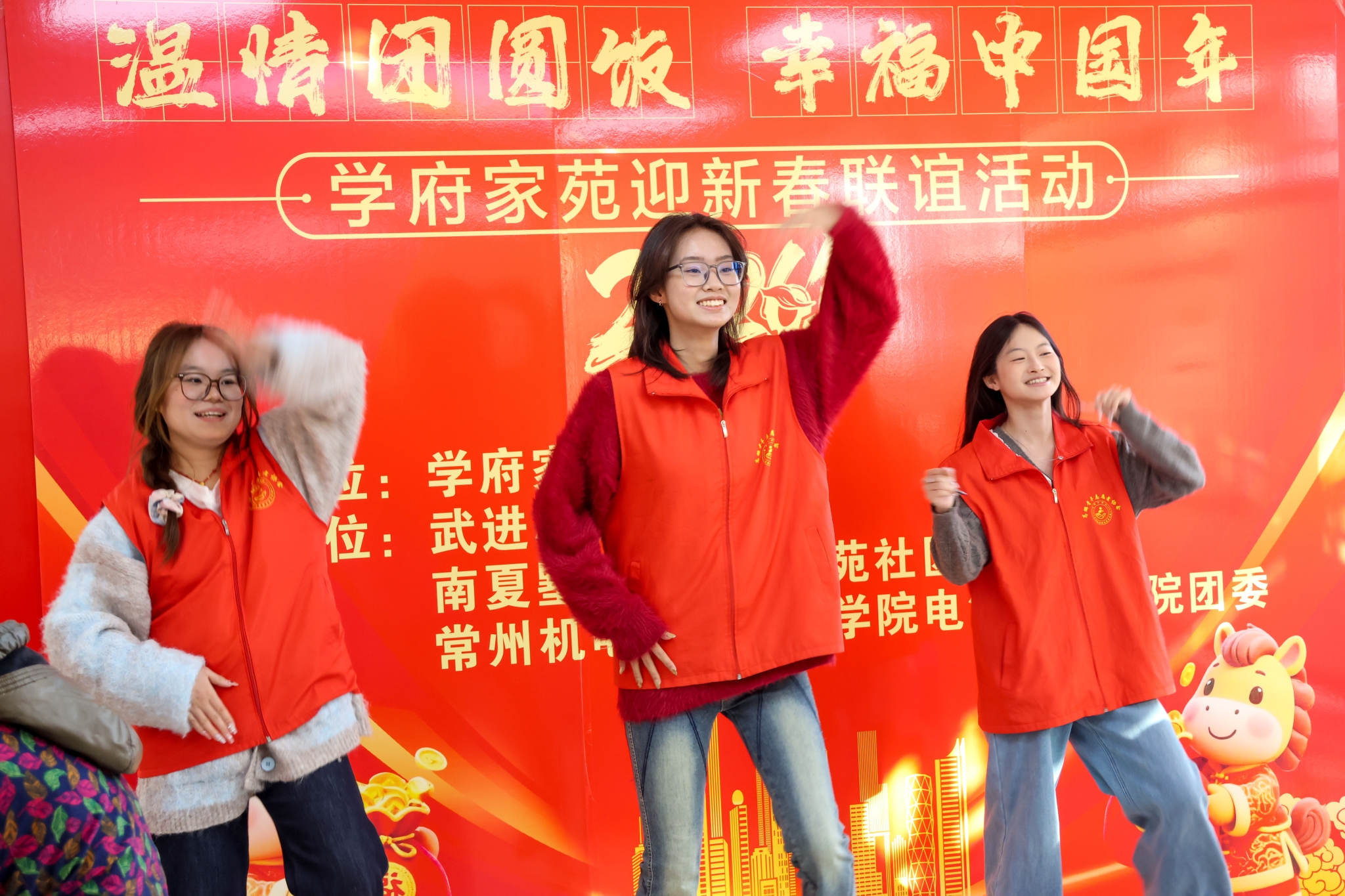 在学府社区,志愿者们组织开展“青春团圆年夜饭”主题活动,活动有序开展、氛围浓厚。志愿者现场书写春联,为居民送上新春祝福;搭建互动舞台,进行歌舞表演并与居民互动;与居民共同包馄饨、布置活动现场,营造团圆祥和的节日氛围。