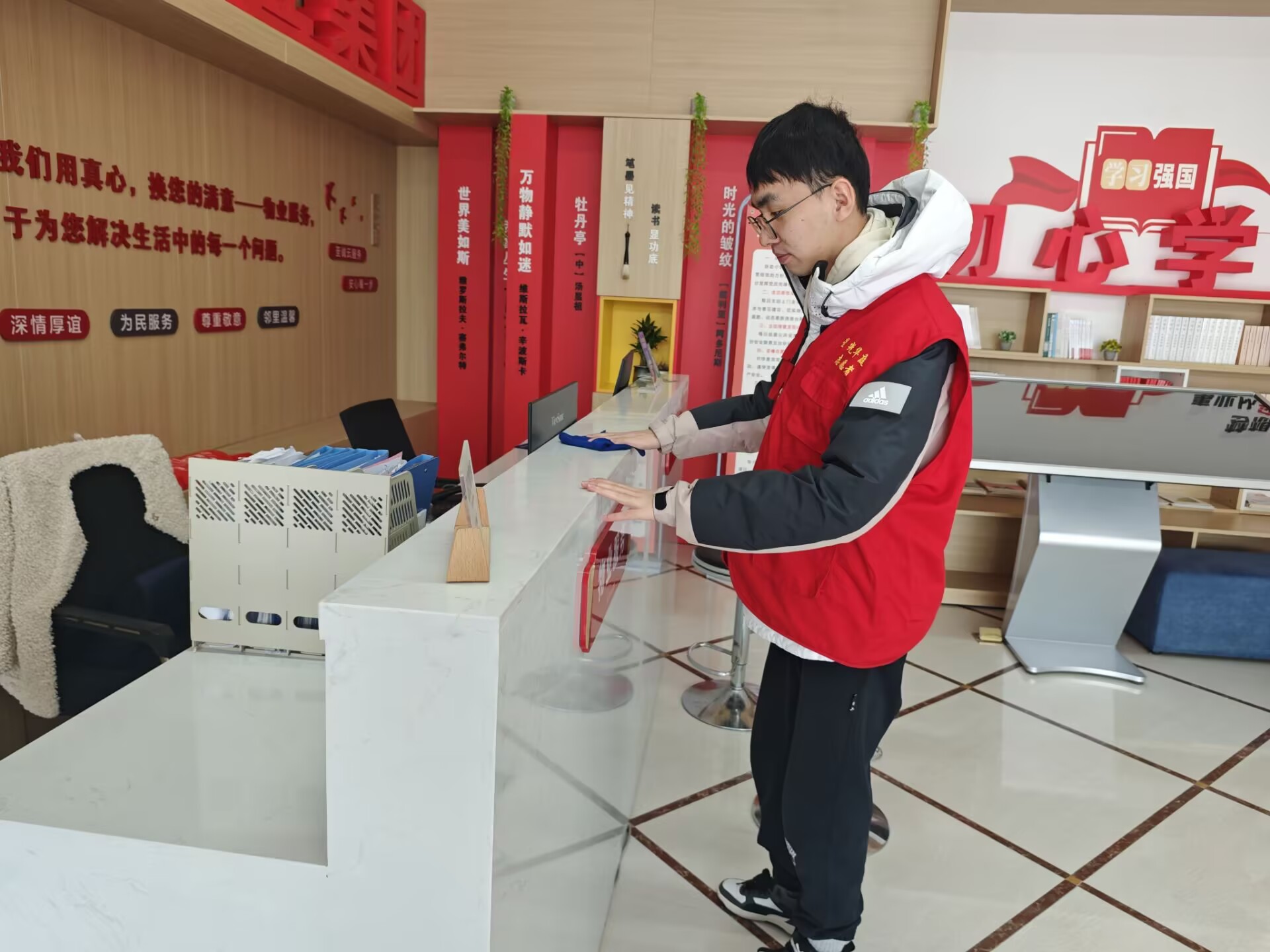 此外,返家乡的志愿者们也在各自社区开展志愿行动。在徐州依东村,志愿者王春海坚守家乡服务一线,协助村干部接待村民咨询,用通俗语言解读医保、养老等惠民政策;在户外开展政策宣传,发放资料并为村民答疑。在连云港云山社区,志愿者金宇坚守志愿岗提供便民服务,仔细整理社区办公环境。在薛家镇中巷社区居家养老中心,志愿者杨欣怡协助社区开展写对联活动,协助老人们铺纸研墨,一同书写春联,畅谈年俗。