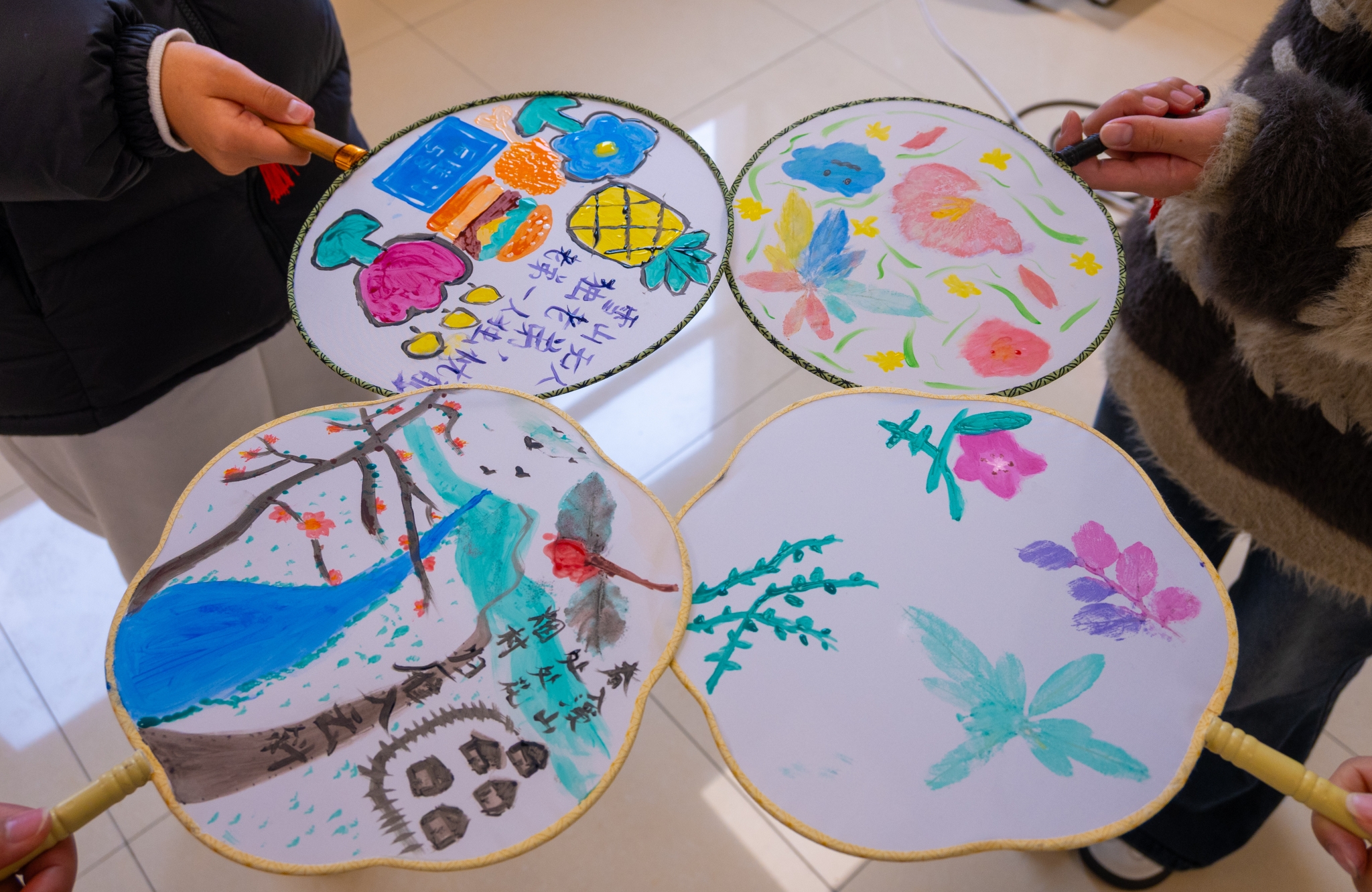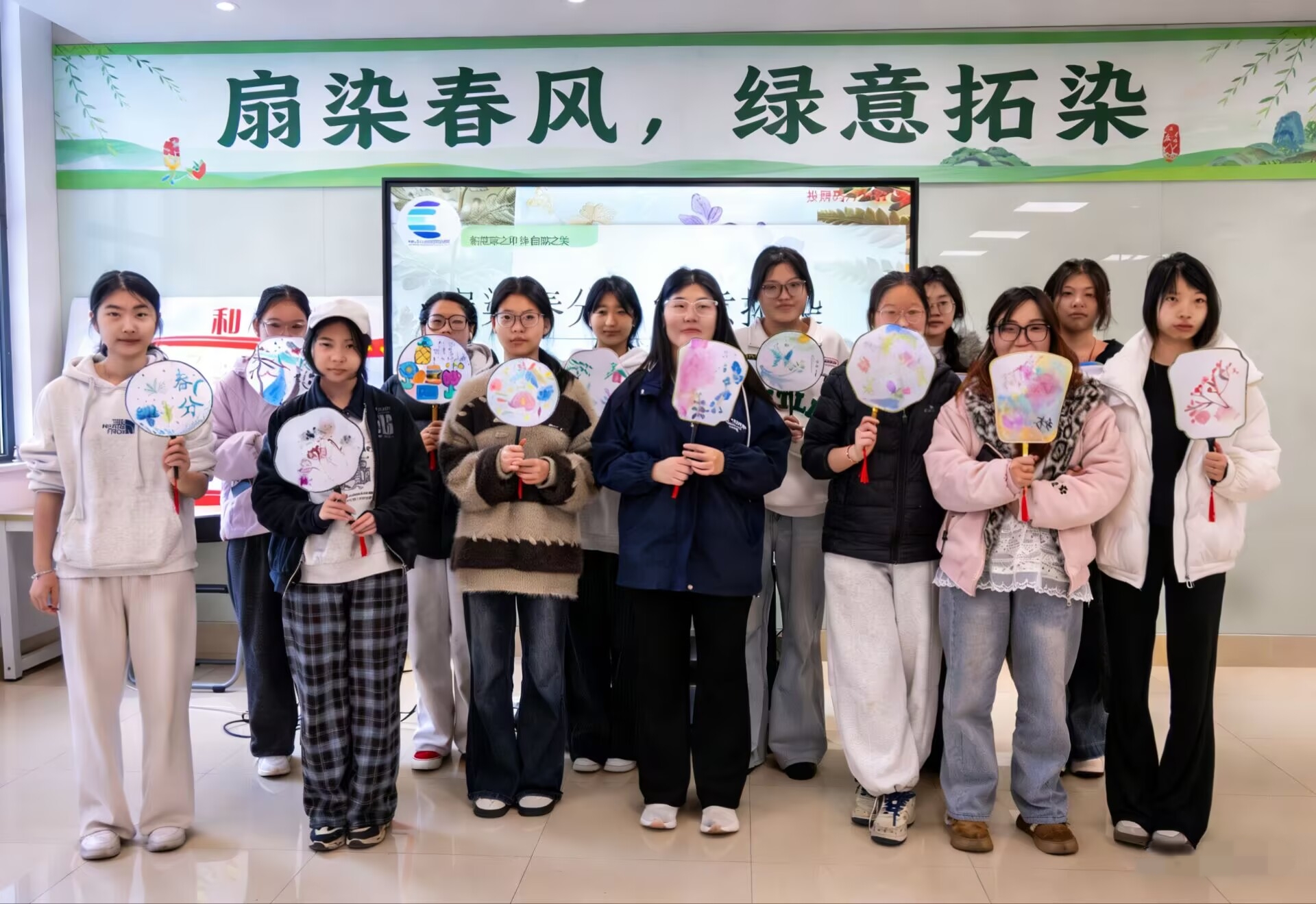 春诗诵读环节,同学们齐声诵读春分主题经典诗句,并将诗句写在扇面上。