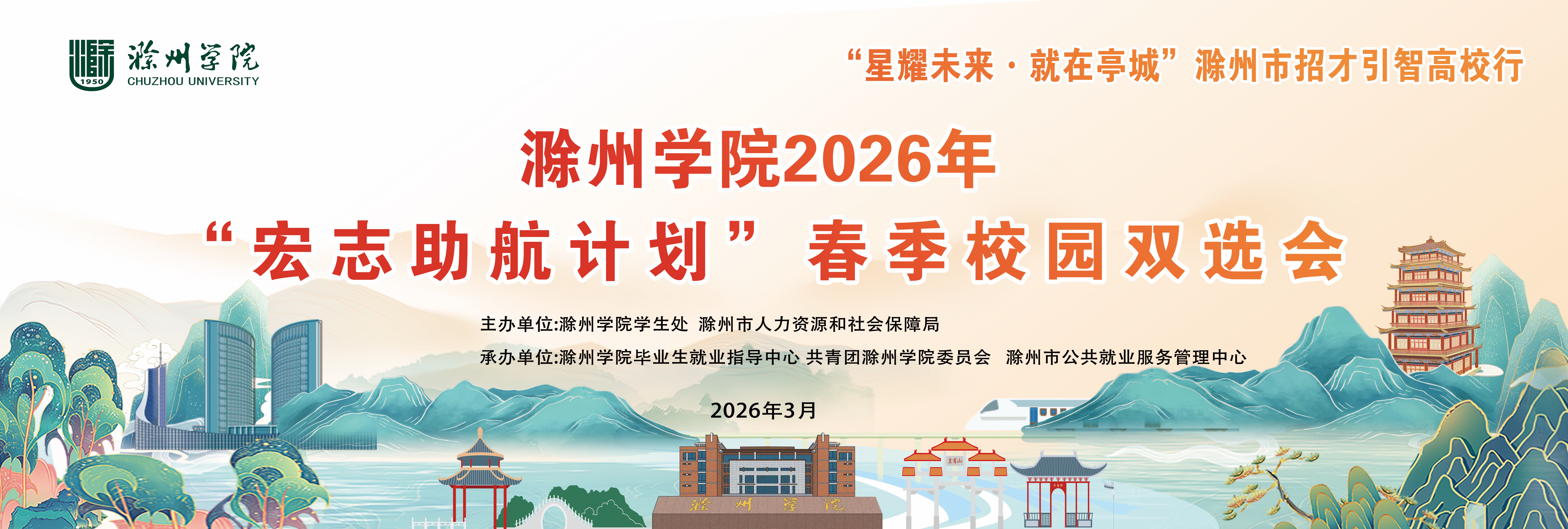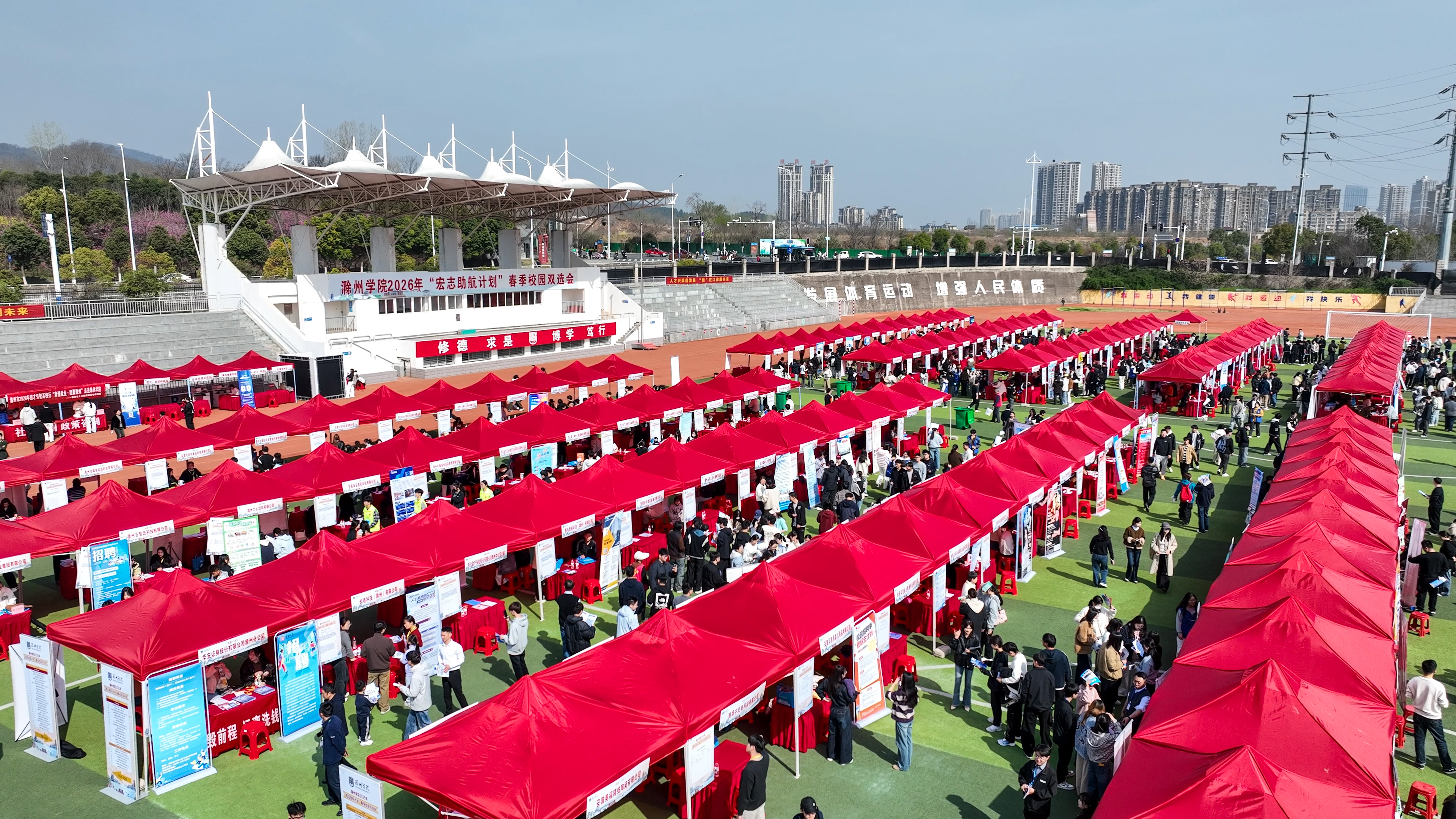 3月28日,滁州学院在会峰校区塑胶运动场举办2026年“宏志助航计划”春季校园双选会,250余家用人单位携5300余个就业岗位进校招贤纳士。副校长王春、校党委常委、副校长曾献功,省大中专毕业生就业指导中心综合办主任彭飞亲临现场指导,学生处、毕业生就业指导中心等部门负责人,各二级学院党政主要负责人、分管学生工作副书记、就业工作具体负责人、毕业班辅导员及2026届毕业生共同参加双选会。