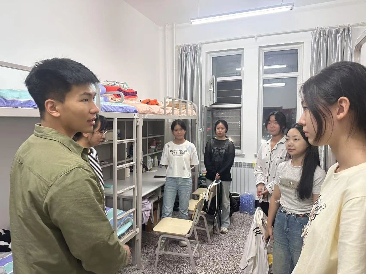 新学期第一天,经济管理学院辅导员姬梓乔和解盛帅来到学生宿舍。他们关心学生们的生活起居,深入了解学生们的思想动态,从学习压力到职业规划,从兴趣爱好到人生理想,无不细致入微。