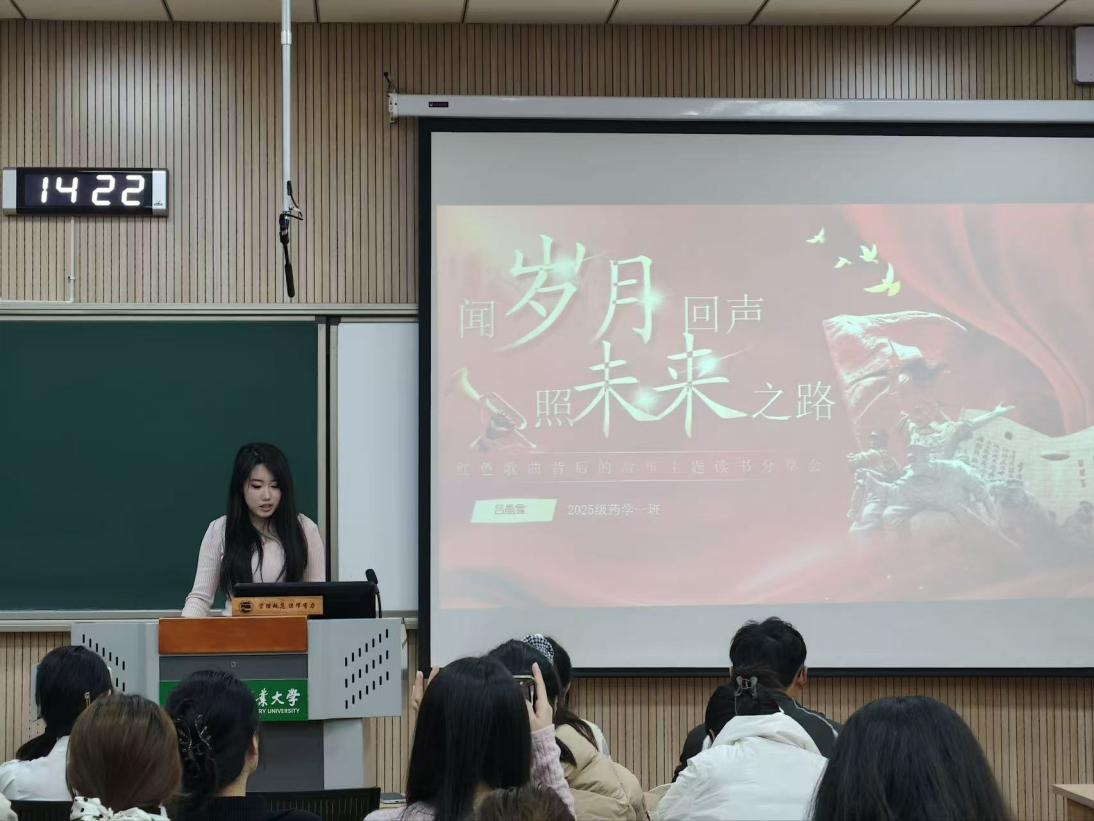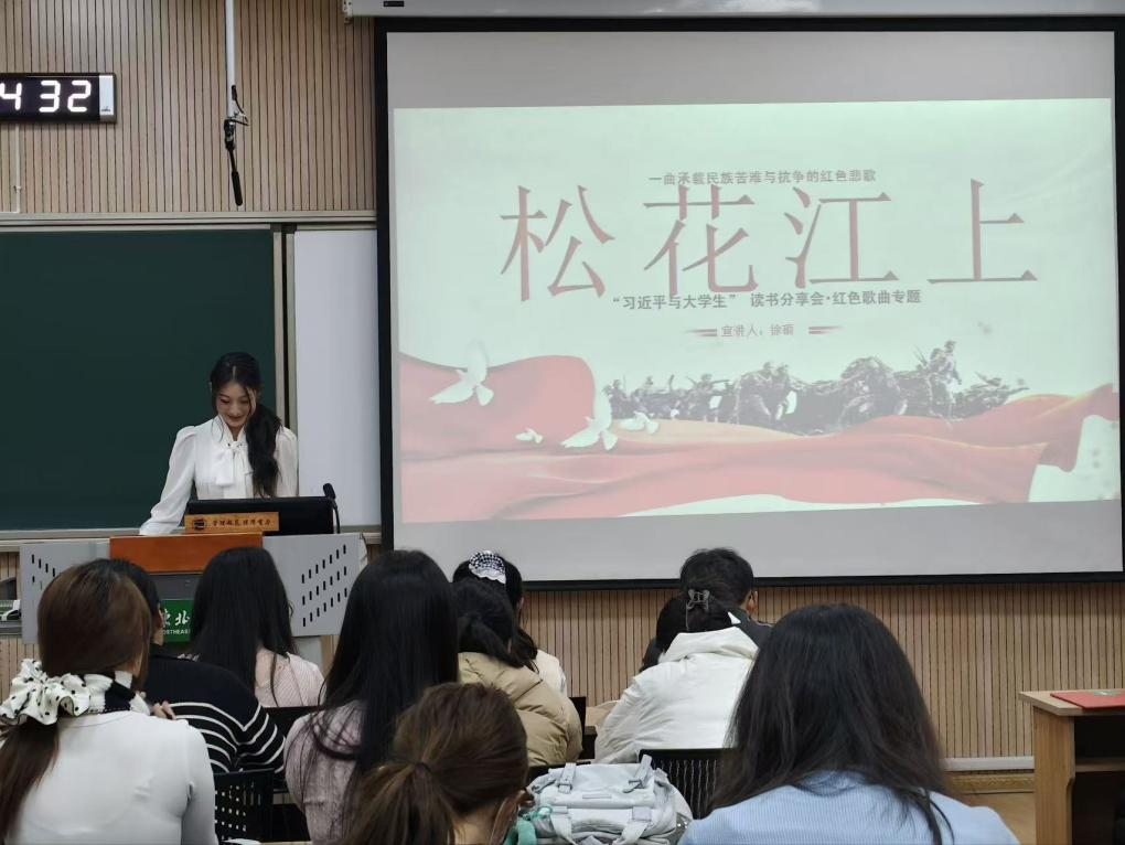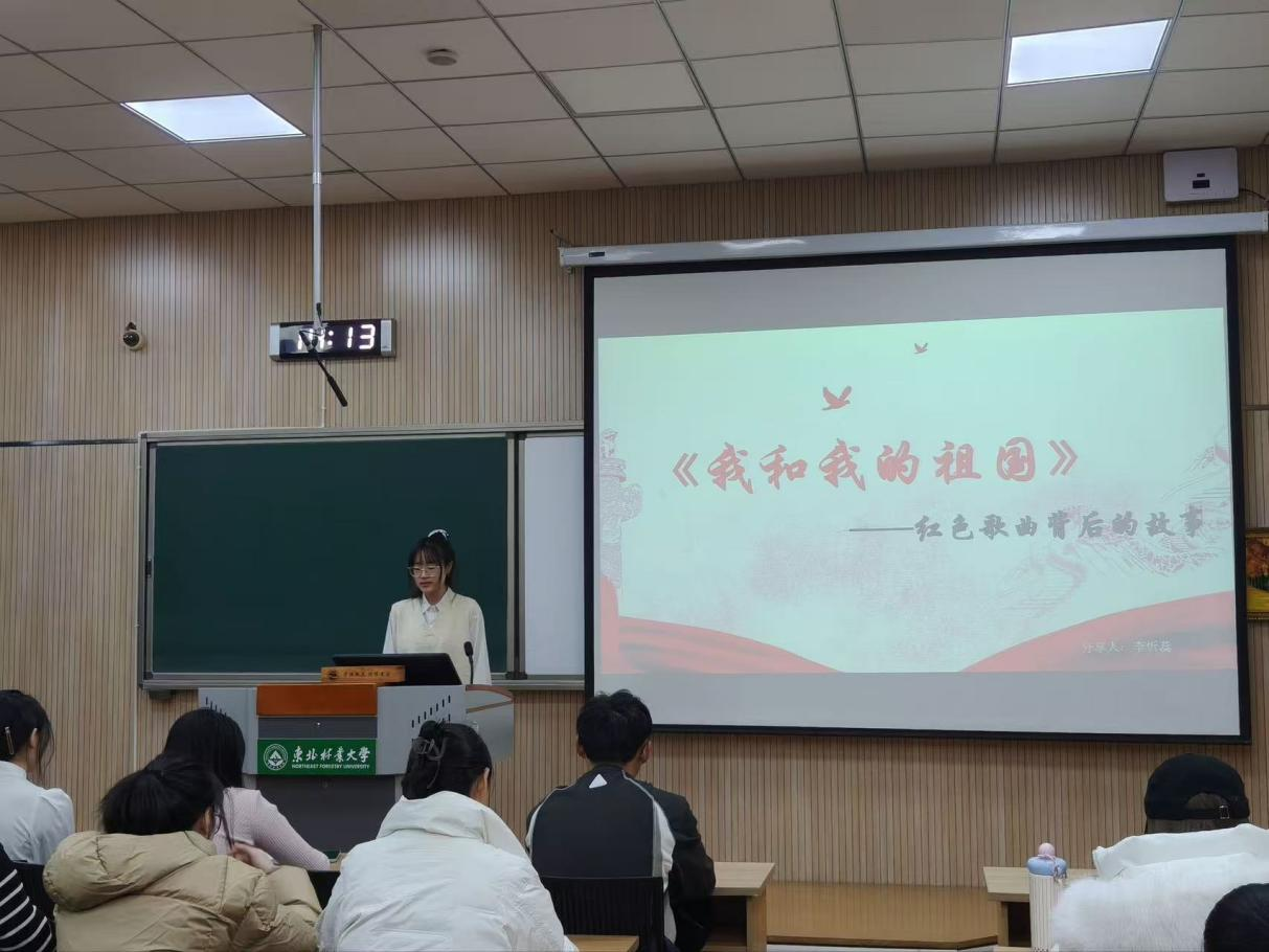 在分享环节,四位同学分别从红色歌曲创作背景、历史意义及精神内涵等方面进行深入解读,同学们仿佛穿越时空,感受到那段波澜壮阔的奋斗历史,深刻理解了红色江山的来之不易。