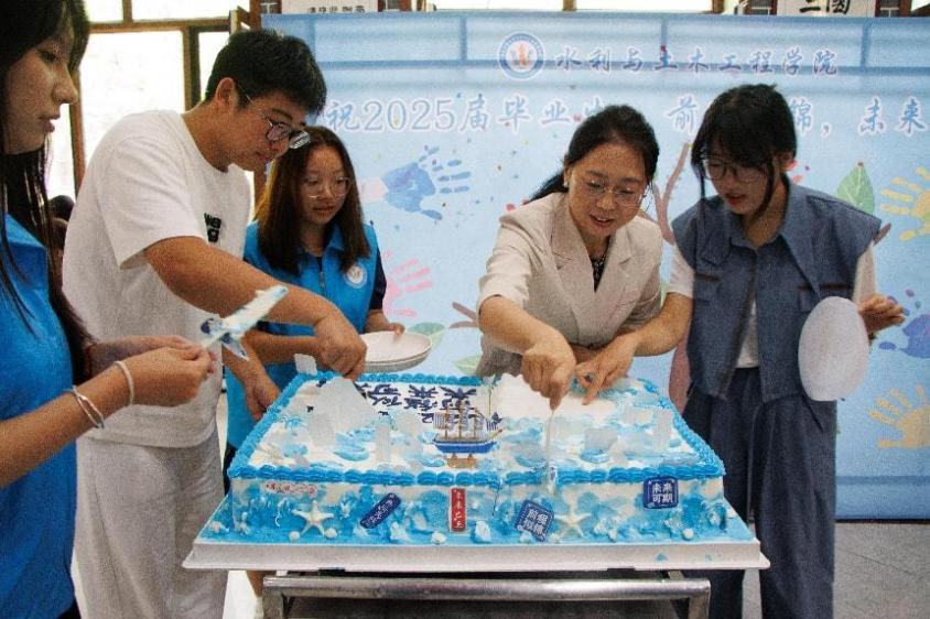 水利与土木工程学院院长李茉殷切希望毕业生“水为师、农为根、梦为帆”,毕业生代表深情演唱了《不说再见》,专业课教师献唱《明天会更好》,辅导员演绎《青春修炼手册》,院长与毕业生共切毕业蛋糕,共享喜悦。全体毕业生在熟悉的旋律中合唱《再见》,用歌声表达了对恩师、同窗的深深眷恋,以及对青春岁月的感怀与珍重。