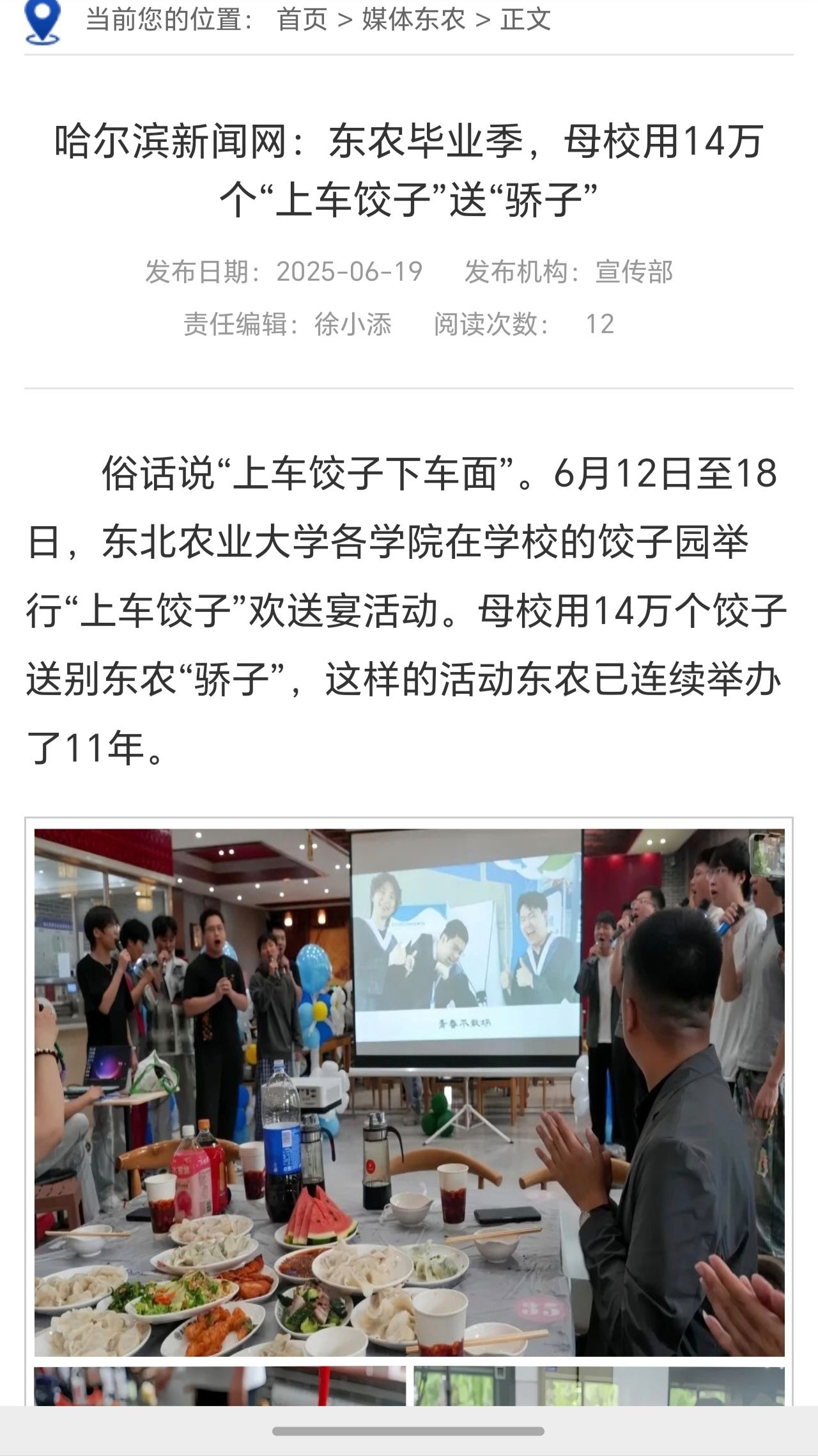 夏木繁荫,芳英缀枝,祝福伴随着饺香飘满了整个校园。6月12日至6月18日,由后勤管理处、学生工作部联合举办的以“今朝东农以饺香寄情,明日栋梁于沃土深耕”为主题的第十一季“上车饺子”圆满结束。校党委副书记贺景平、副校长姜毓君、学生工作部部长汪志君、各学院领导班子、专业教师代表、全体辅导员与毕业生齐聚“饺子宴”共叙过往、共话未来。活动得到了中国新闻网等媒体报道。