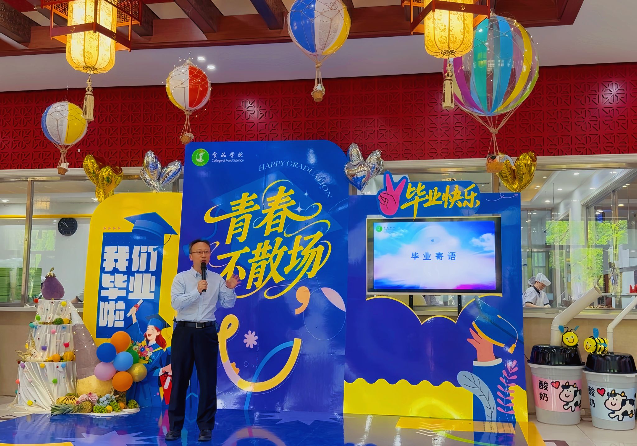食品学院以“巧手塑就温情宴,丹心孕育栋梁才”为主题为学子送祝福,学院党委书记施喜军、院长李良致辞,祝愿学子以赤子之心拥抱时代,与家国同频奋进。全体辅导员演绎《向快乐出发》,毕业生合唱《凤凰花开的路口》,学联诗朗诵《致我们的青春岁月》,传递真挚情谊。活动融入绿色环保理念,“变废为宝”的创意装饰装点现场,展现巧思与育人情怀,让毕业礼暖胃又暖心,成学子奔赴天地的温暖行囊。
