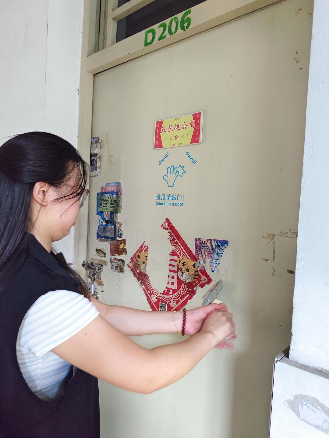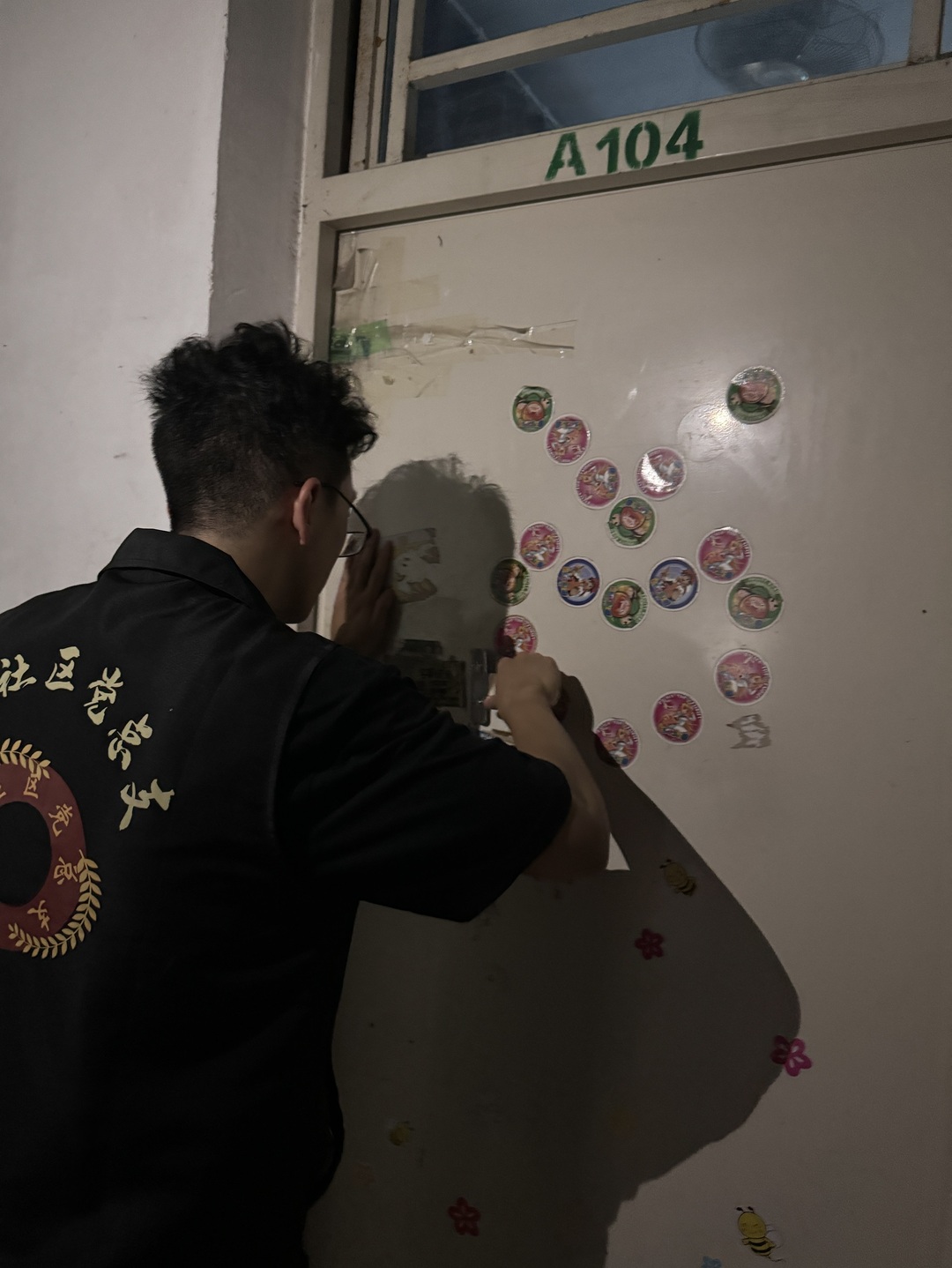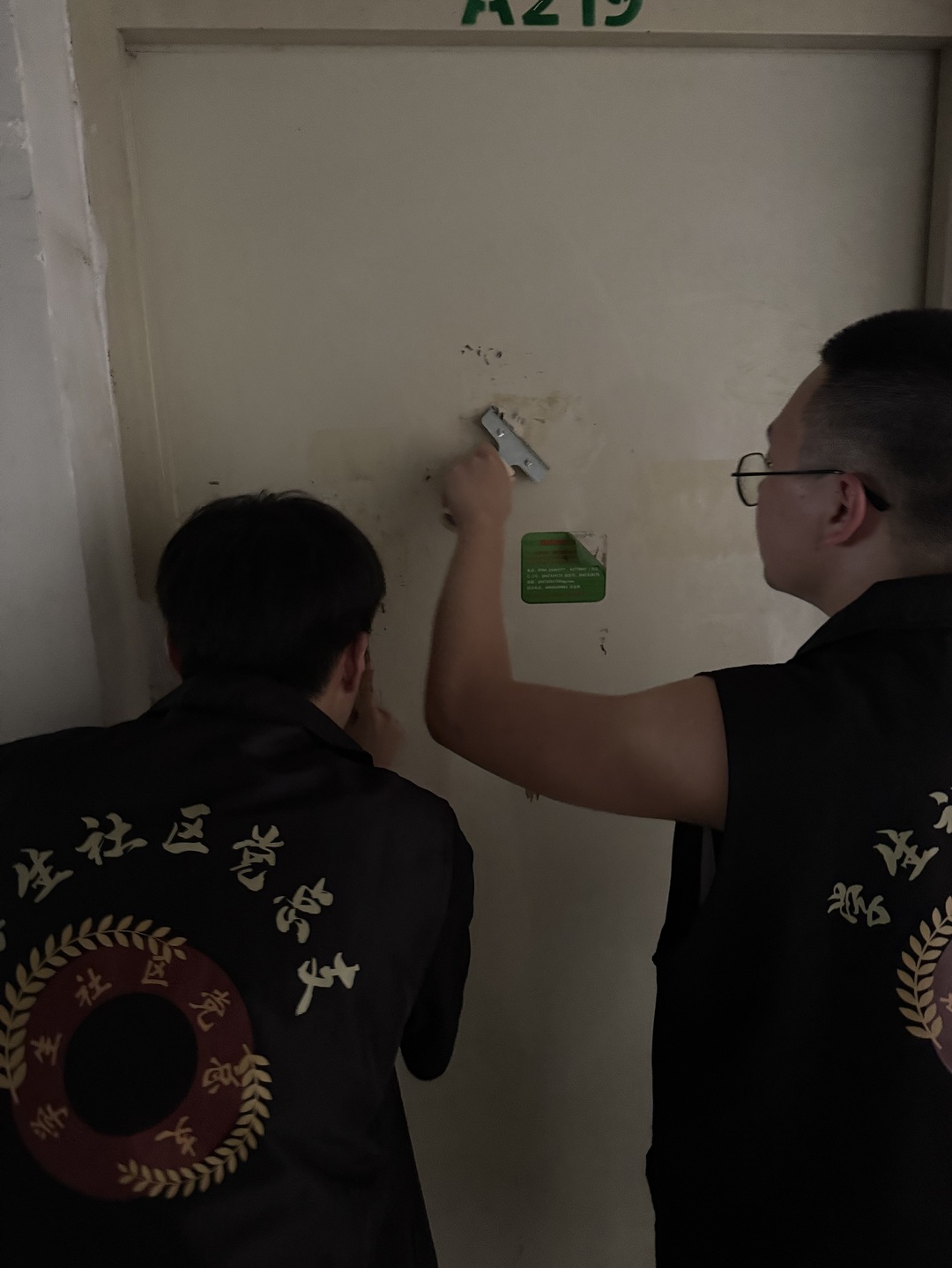 行动开始,先锋志愿者们热情高涨,迅速投入到清理工作中。大家分组行动,对务实社区低楼层120余间寝室门上的 “牛皮癣” 广告进行了地毯式清理。