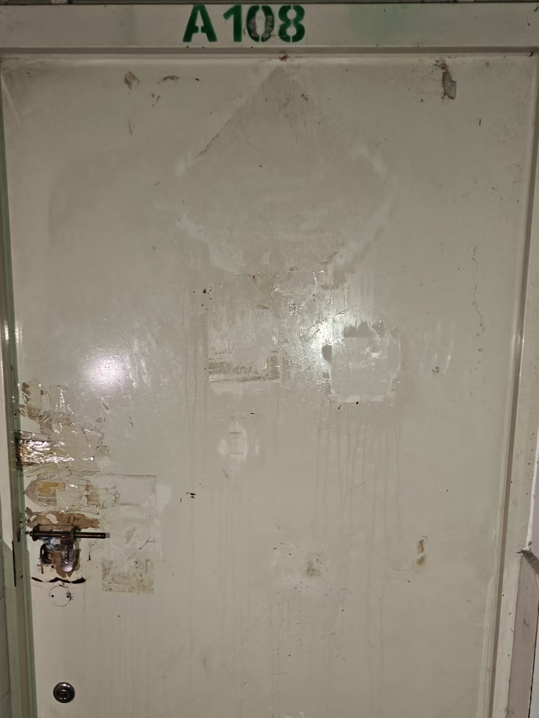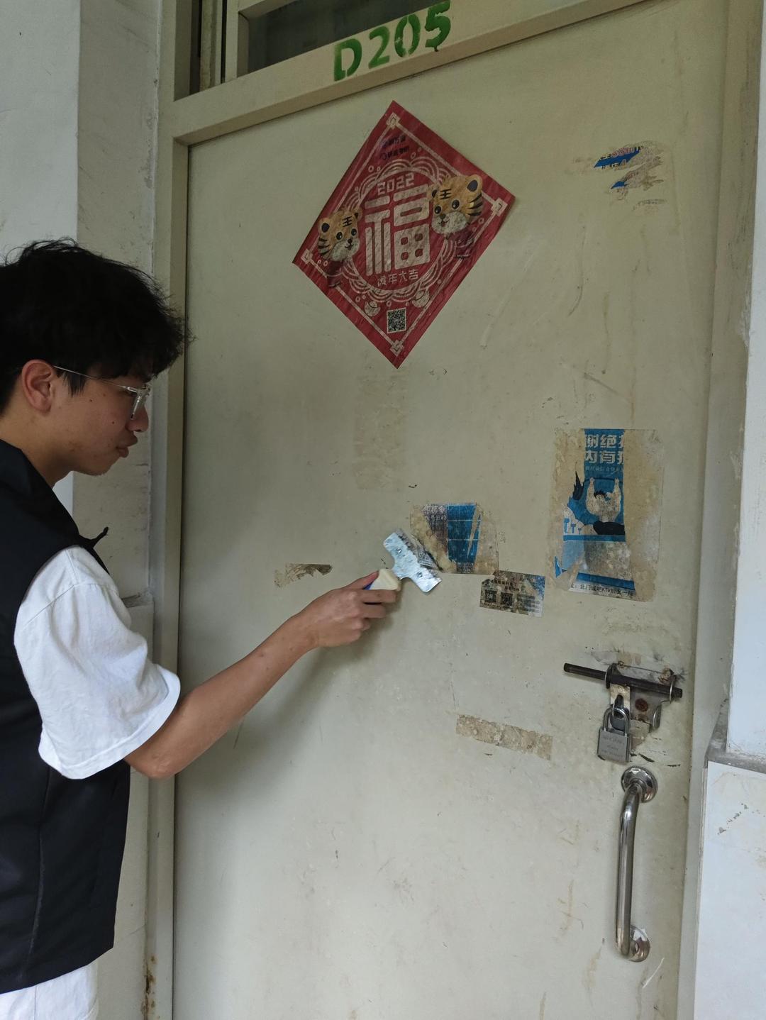 面对顽固的小广告,先锋志愿者们先用喷壶将广告纸浸湿,再用铲子一点点仔细铲除。经过几个小时的努力,原本布满 “牛皮癣” 广告的宿舍门焕然一新。