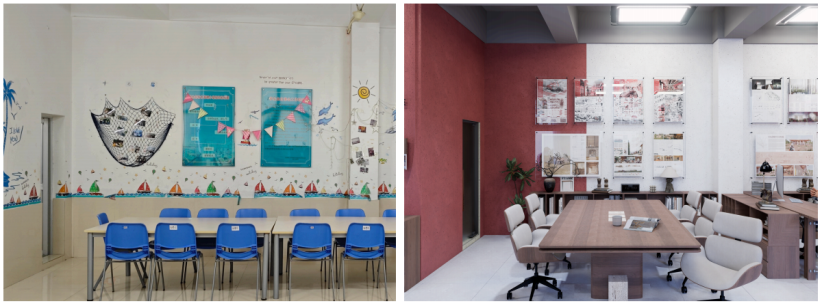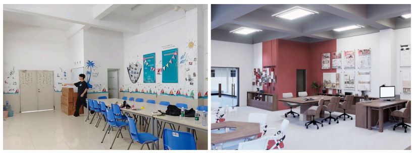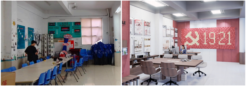 本次合作中,创意设计学院鲍艳红老师的《办公空间设计》与郑悦老师的《景观设计方法》两门课程,打破传统课堂的虚拟场景限制,将知行社区党总支办公室、学四学六中庭设为真实场景设计课题。