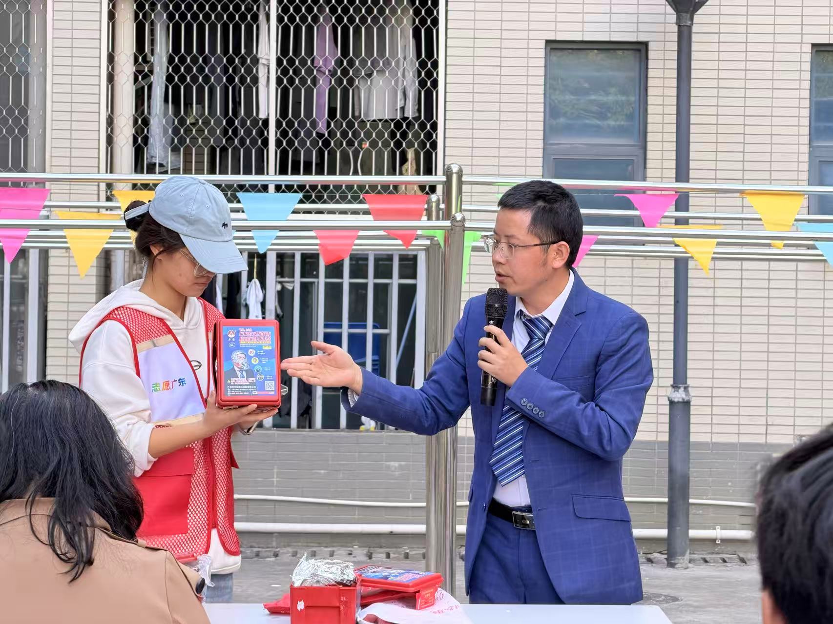 活动现场,张飞老师的消防知识讲座干货满满。他结合真实校园火灾事故案例剖析诱因,系统讲解了消防设施及器材认知、消防安全隐患排查等知识。在器材认知模块,他现场演示了自救呼吸器的正确使用方法,并细致传授了火灾初期处置与人员疏散逃生的技巧,让师生们直观掌握了实用的消防技能。