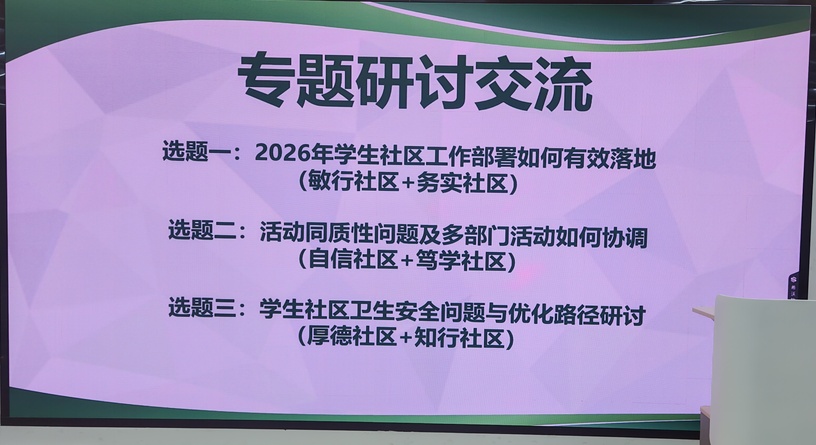 专题研讨会紧扣学生社区发展核心痛点,围绕 “2026 年学生社区工作部署有效落地”“活动同质性破解与多部门活动协调”“学生社区卫生安全优化路径” 三大议题展开深度研讨。每个议题均由两个社区代表率先分享实践经验,参会人员结合工作实际各抒己见、建言献策,在思想碰撞中凝聚破解难题的共识,在交流探讨中明确工作推进的路径。