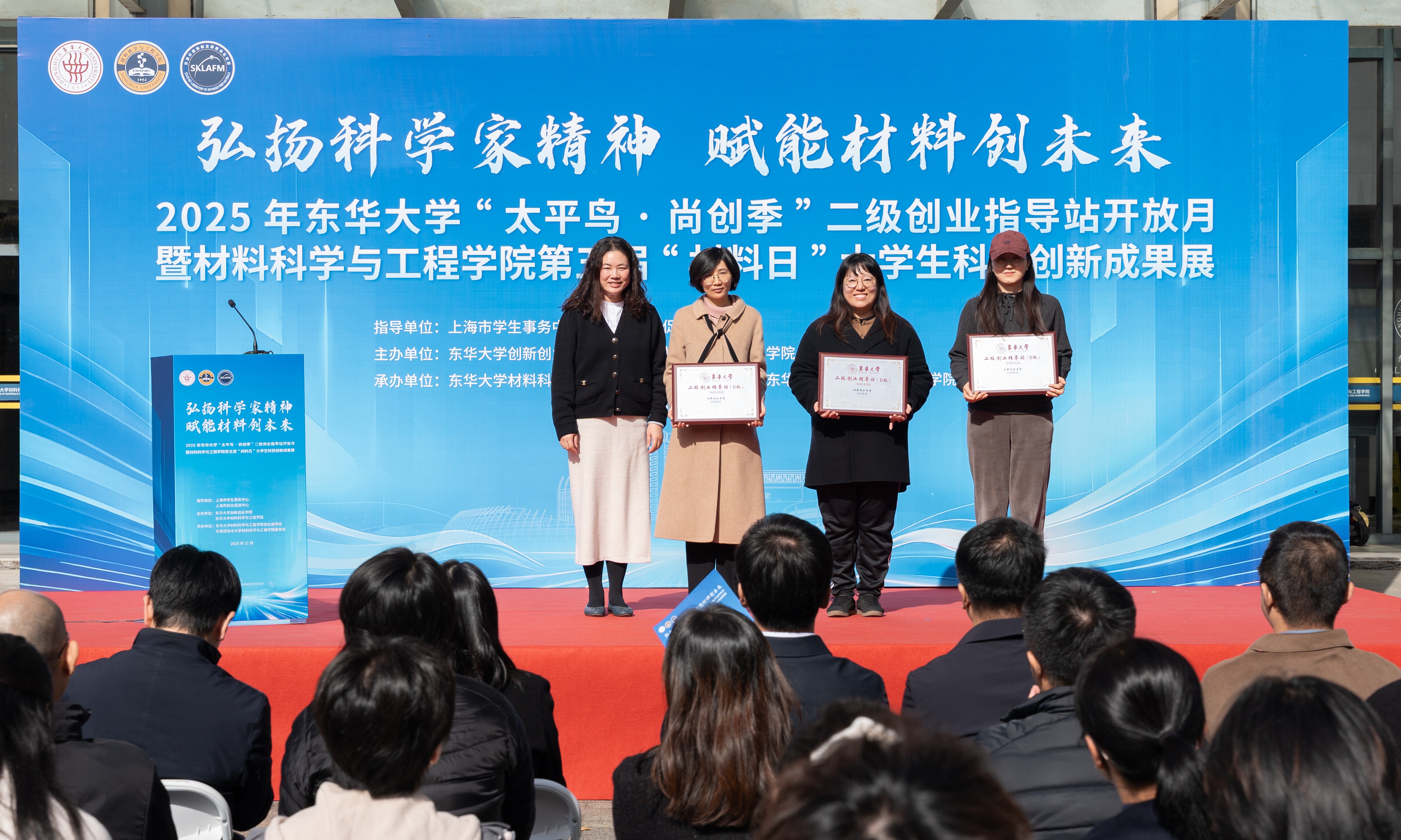 11月25日,东华大学“太平鸟·尚创季”二级创业指导站开放月启动仪式暨材料科学与工程学院第五届“材料日”大学生科技创新成果展举行。校党委副书记李成龙出席,上海市就业促进中心创业指导处处长蔡东海、上海市学生事务中心和松江区就业促进中心相关负责同志,学校相关职能部处负责人,各学院党委副书记,材料学院党政班子成员、各系所负责人及师生代表参加活动。启动仪式由材料学院党委副书记景亮主持。