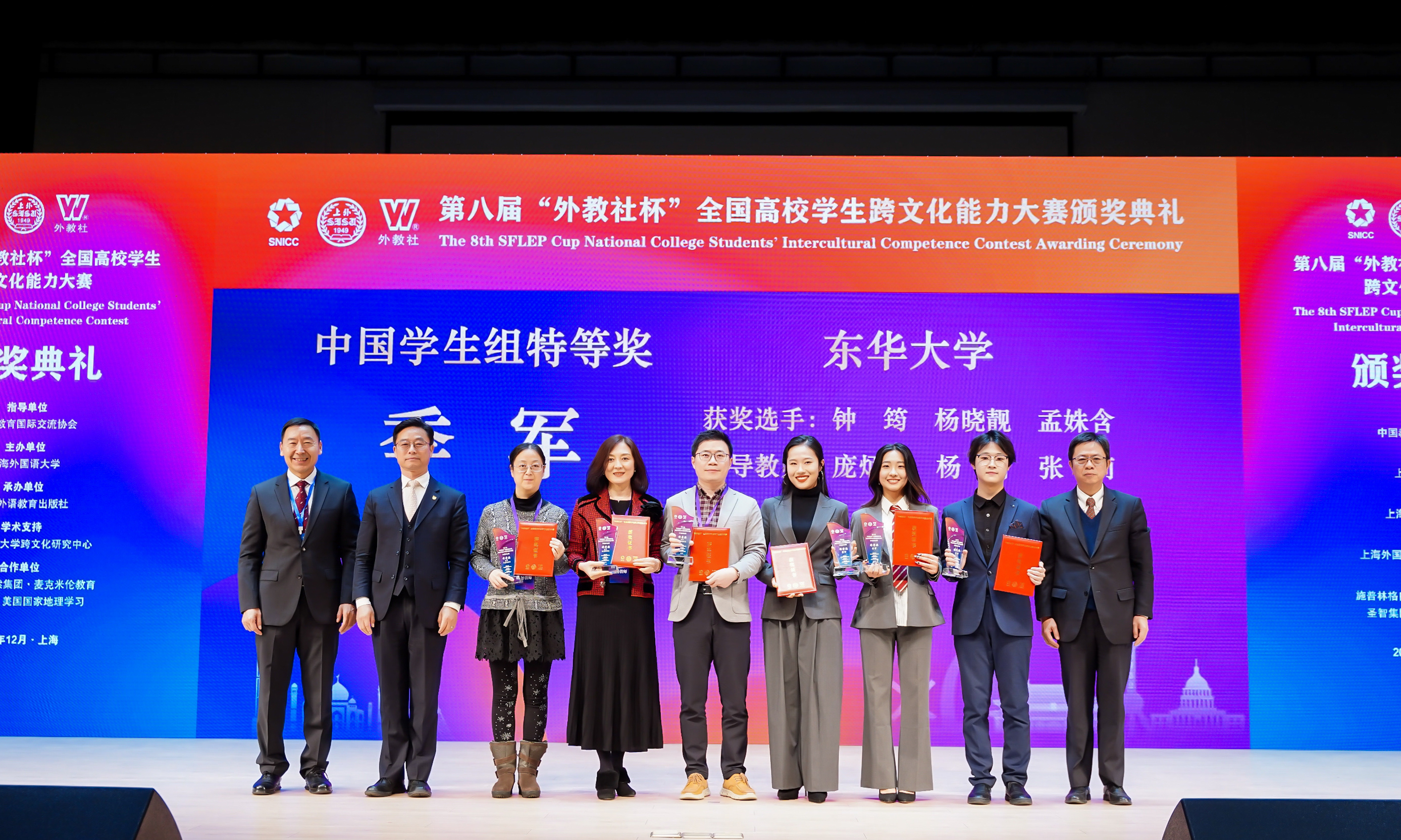 12月11日-14日,第八届“外教社杯”全国高校学生跨文化能力大赛全国决赛和总决赛在上海外国语大学举办,我校由外语学院钟筠、材料科学与工程学院杨晓靓、服装与艺术设计学院孟姝含三位同学组成的参赛团队夺得特等奖,钟筠荣获“最具潜力奖”。我校团队继该比赛上海赛区荣获特等奖后,再创佳绩。