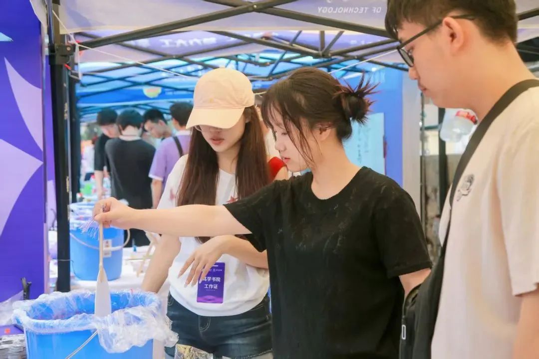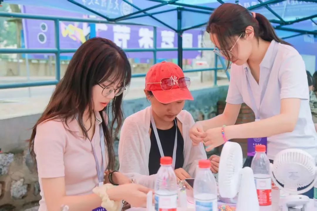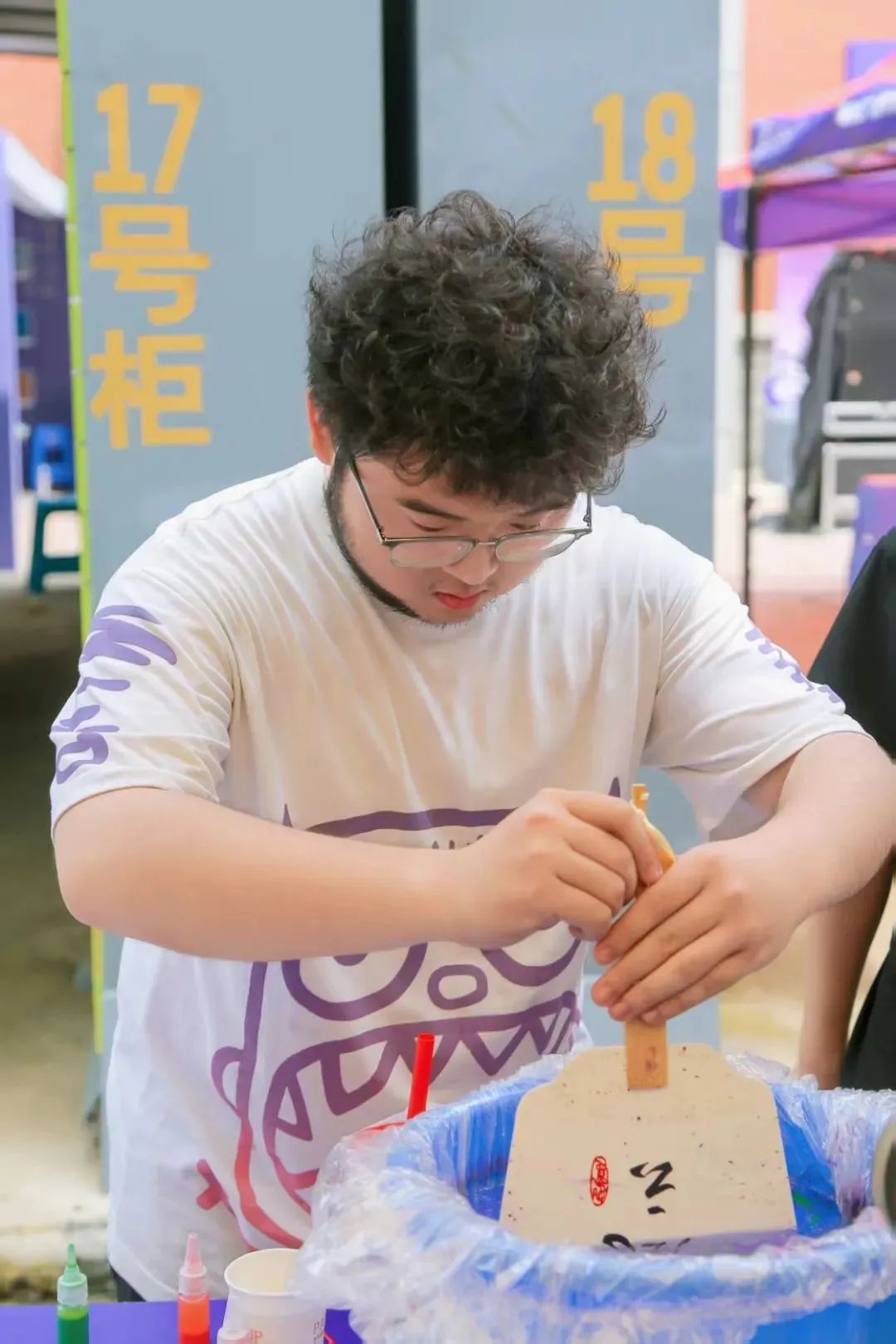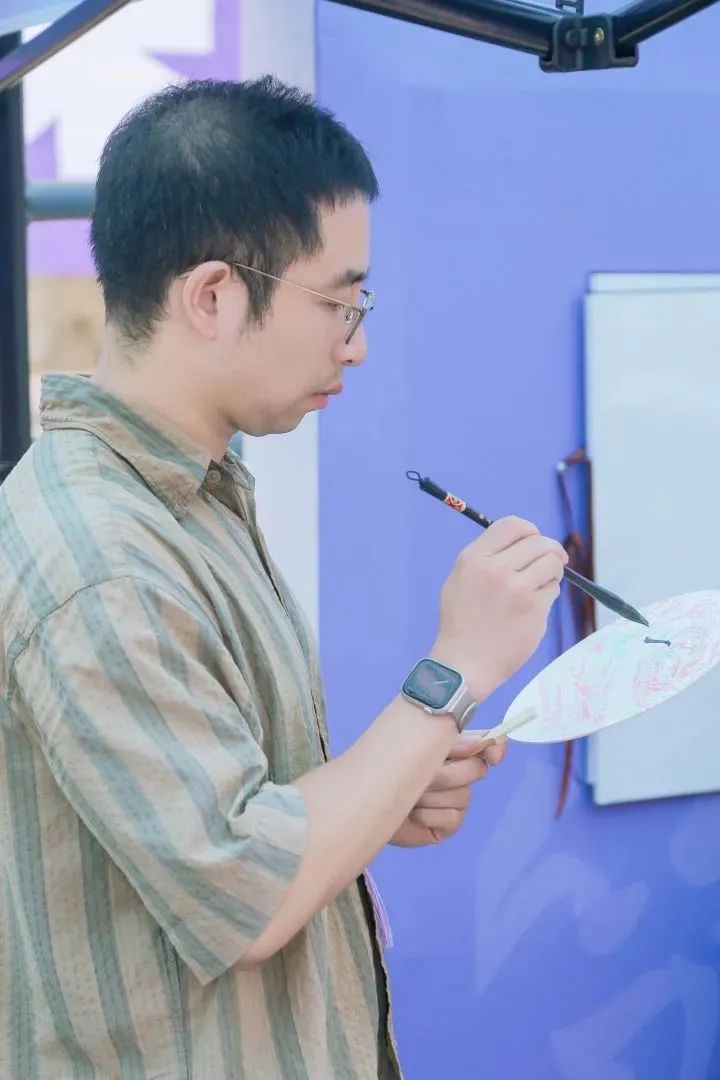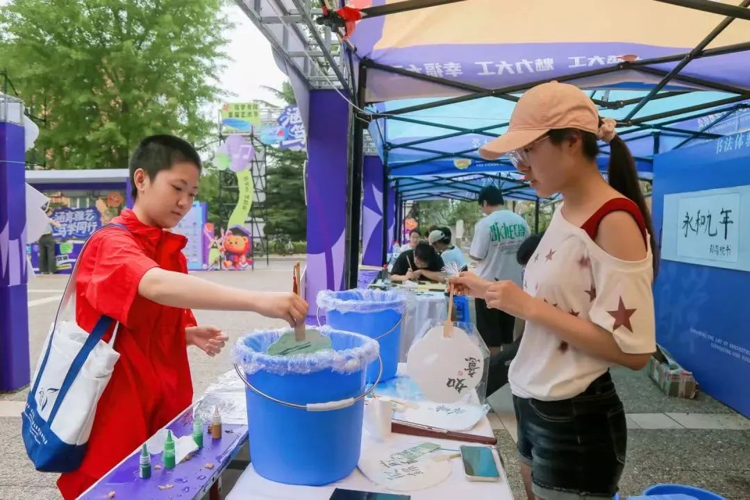 在漆扇工艺区,同学们蘸取漆料在素白的扇面尽情展现着自己的创意,待漆色渐干,便成了独属于自己的夏日清凉。
