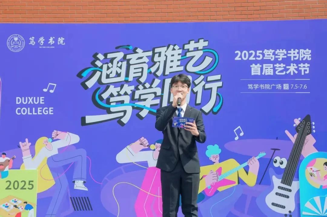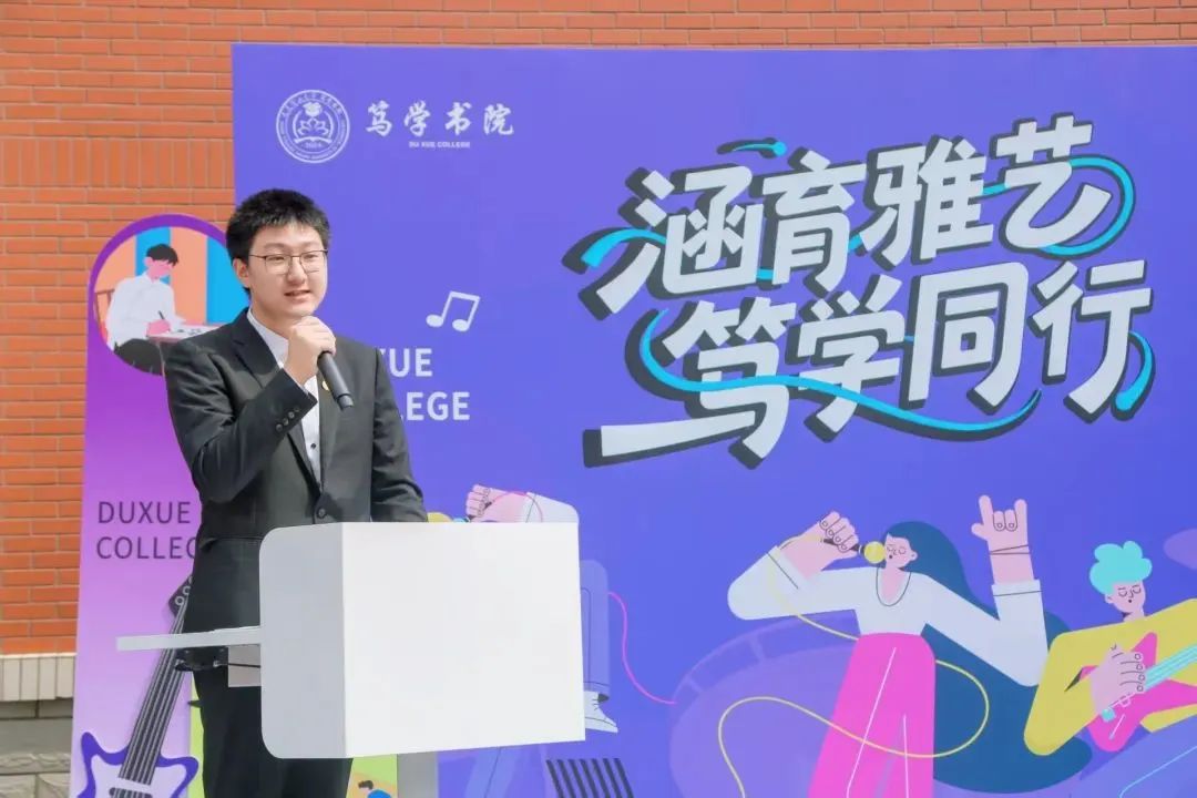 开幕式上,笃学书院2404班贺淇作为2024级笃学书院学生代表发言,在笃学书院2410班沈施达同学的主持下,“涵育雅艺,笃学同行”笃学书院首届艺术节正式开幕!