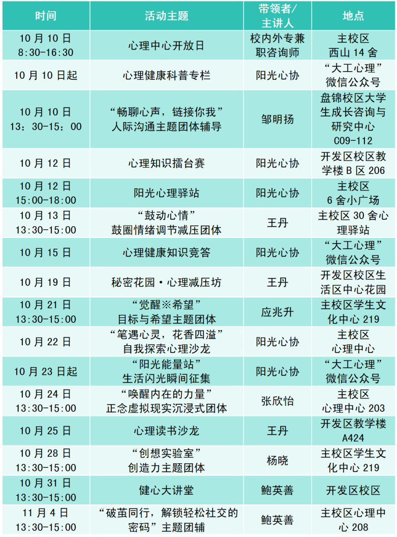今年是我校第十八个“10·10心理文化月”,期间将会举办心理中心开放日、心理医生进校园、心理知识竞赛、团体心理工作坊、心理沙龙、健心讲堂、心理读书会、心理在线征集等各类心理活动,详情见下表: