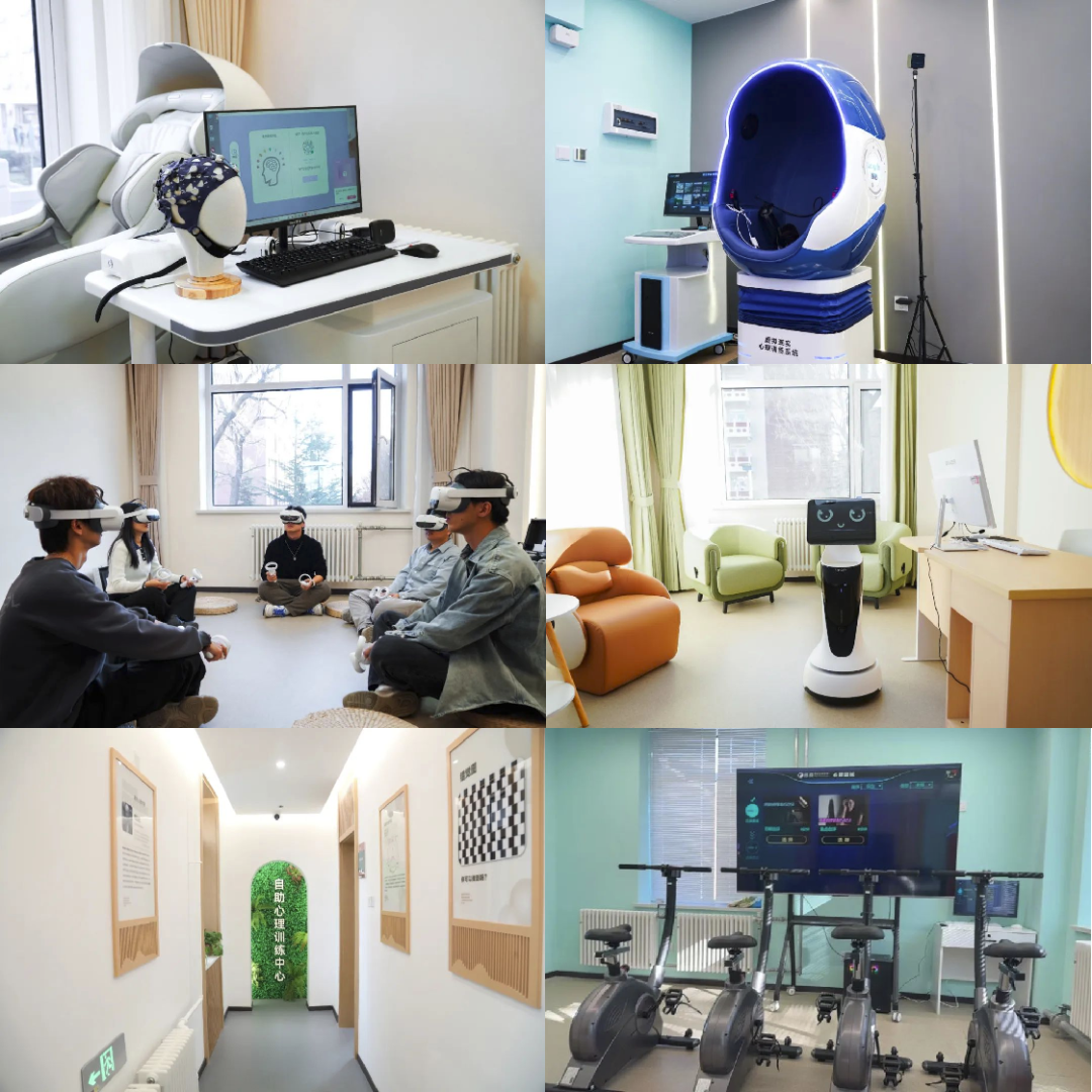 自助心理训练中心设有仿真运动健身室、VR心理训练室、智慧脑电心理测评室、心理沙盘空间、正念训练空间、身心训练室、深睡小屋、团体生物反馈训练室等空间,同学们可以在健心员的引导下,体验情绪舒缓、运动宣泄、心理评估、减压静心、助眠放松等心理训练。