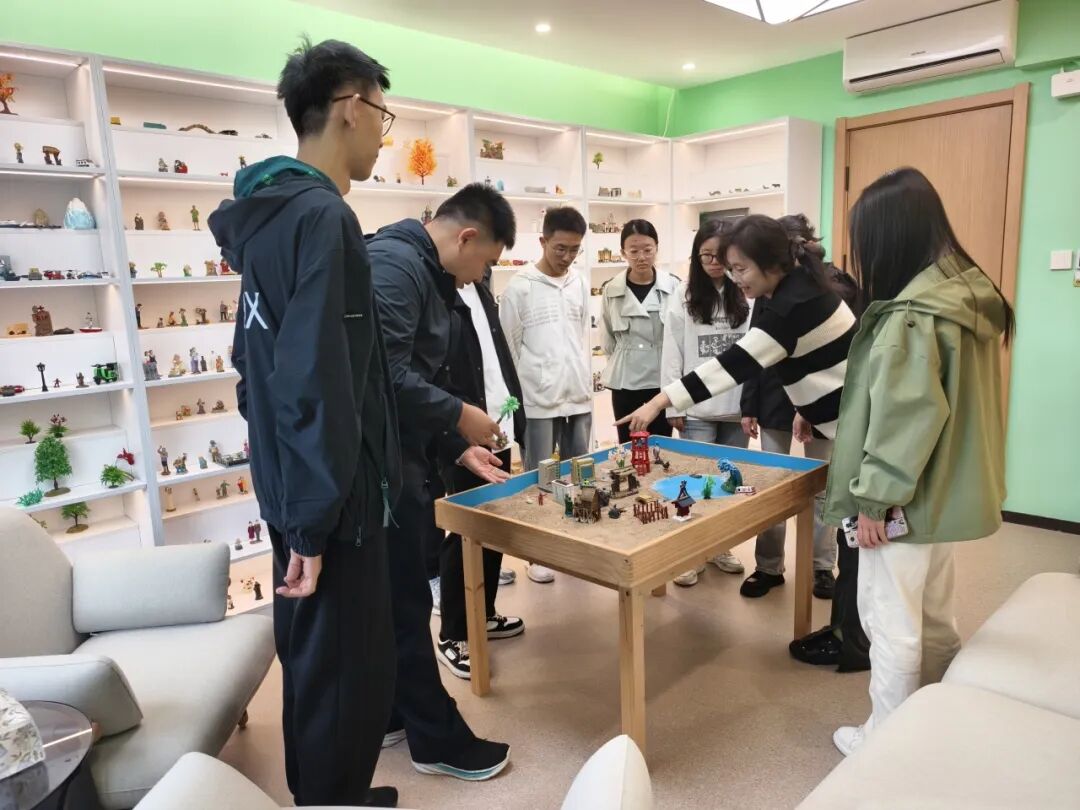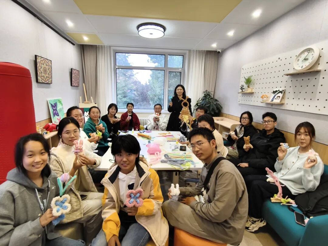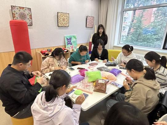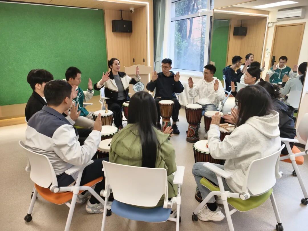 在“沙海寻梦”沙盘区内,同学们在杨晓老师的引导下构建出属于自己的心灵图景;在“黏土心世界”手工区,刘倩老师带领大家揉捏黏土,在创作中释放压力;在“心鼓相和”艺术团体区,王丹老师与同学们一起敲击非洲鼓,在节奏互动中传递快乐,打破隔阂;“扭出心花”创意工坊中,应兆升老师与张欣怡老师共同指导同学们用扭扭棒创作作品,缓解焦虑情绪,收获积极体验。自助心理训练区同样人气高涨,仿真运动健身室、VR心理训练室、深睡小屋等科技空间有序开放,健心员们耐心引导,热心服务,师生们在科技辅助中放松身心、调节情绪。