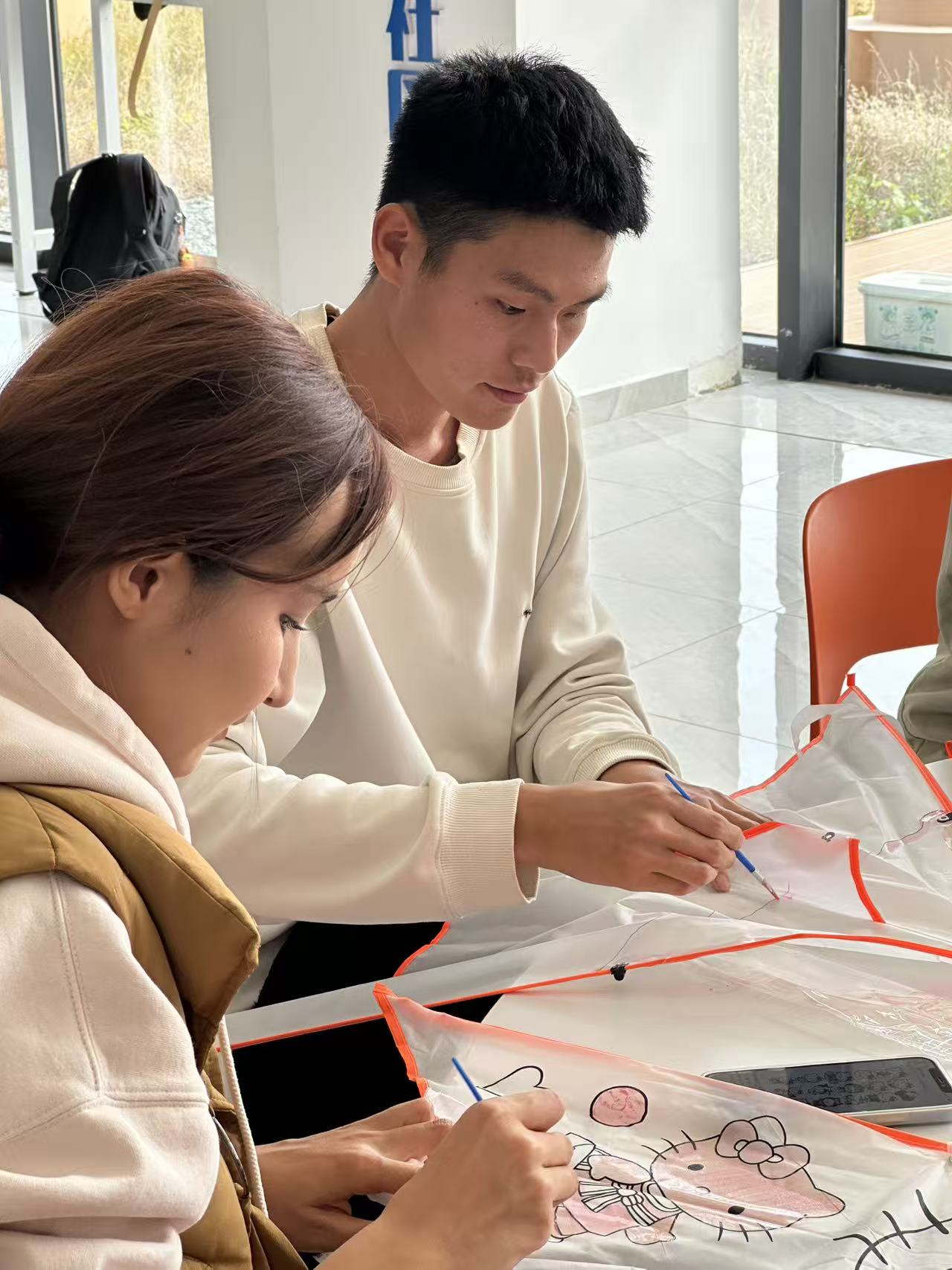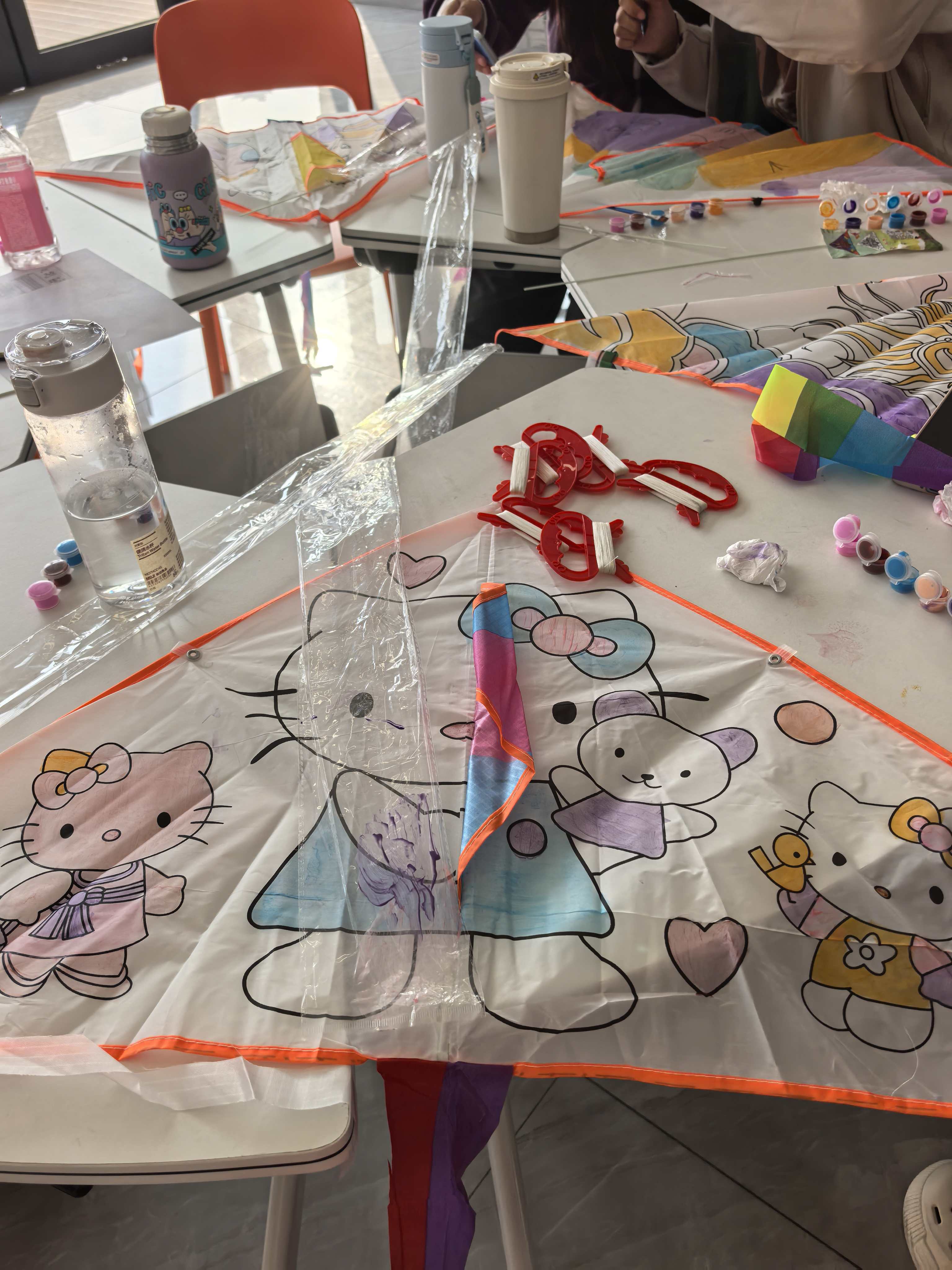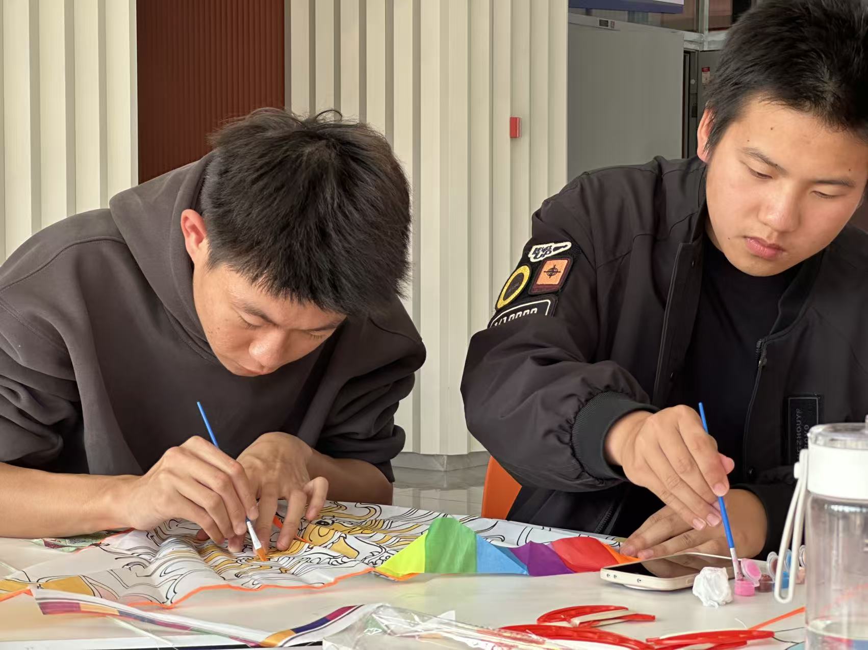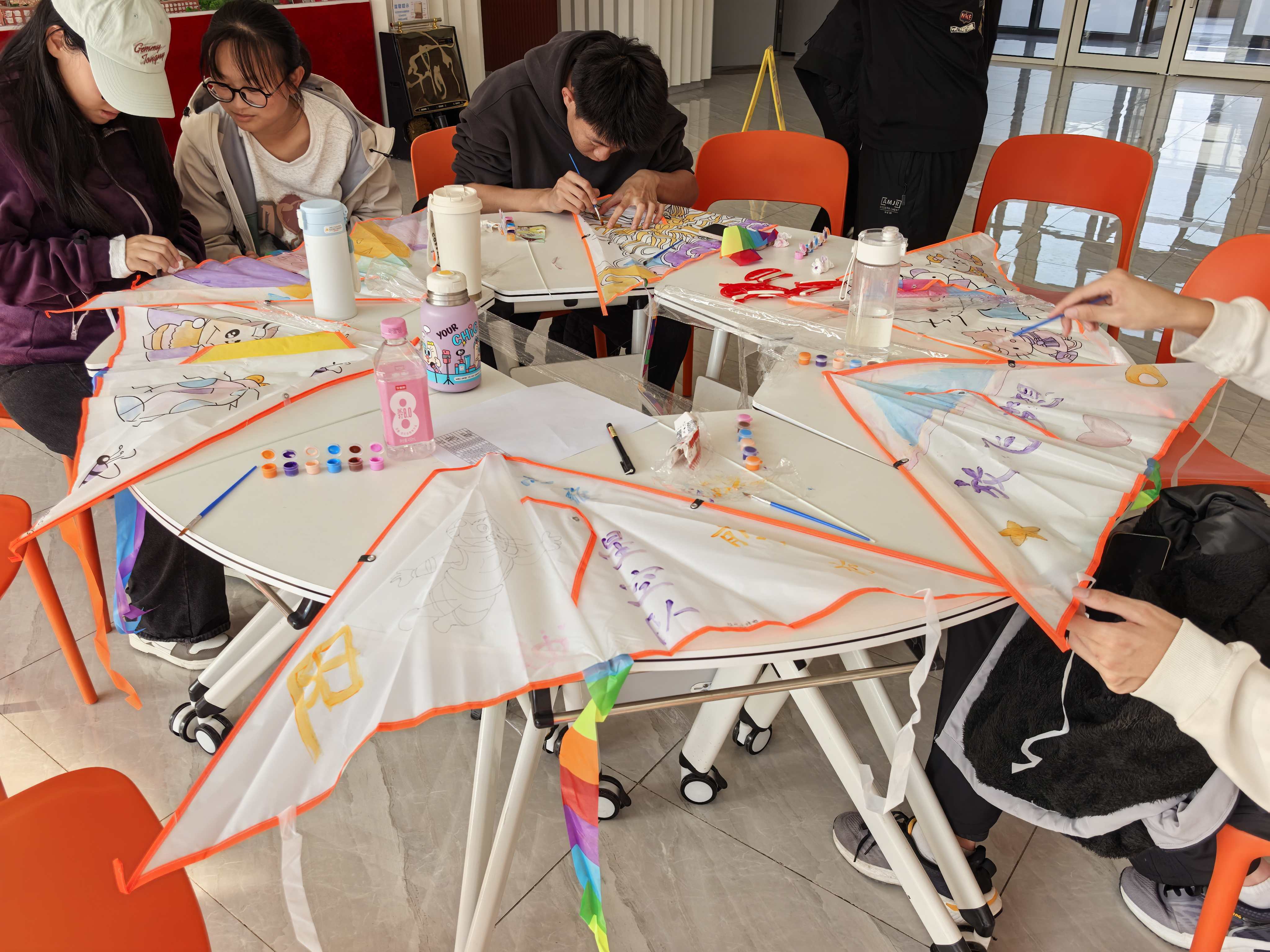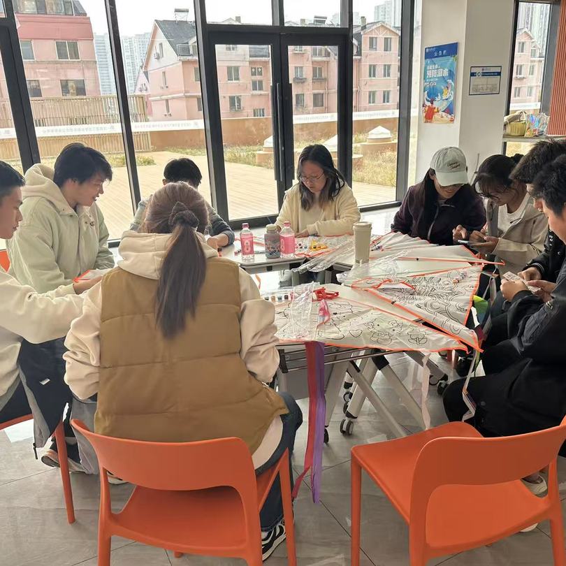 随后,工作人员将风筝、棉线、颜料等材料一一分发,大家两人一组协作创作:有人勾勒山水纹样,有人调配鲜艳色彩。现场气氛活跃,同学们互相分享有趣的想法,活动室里满是欢声笑语。