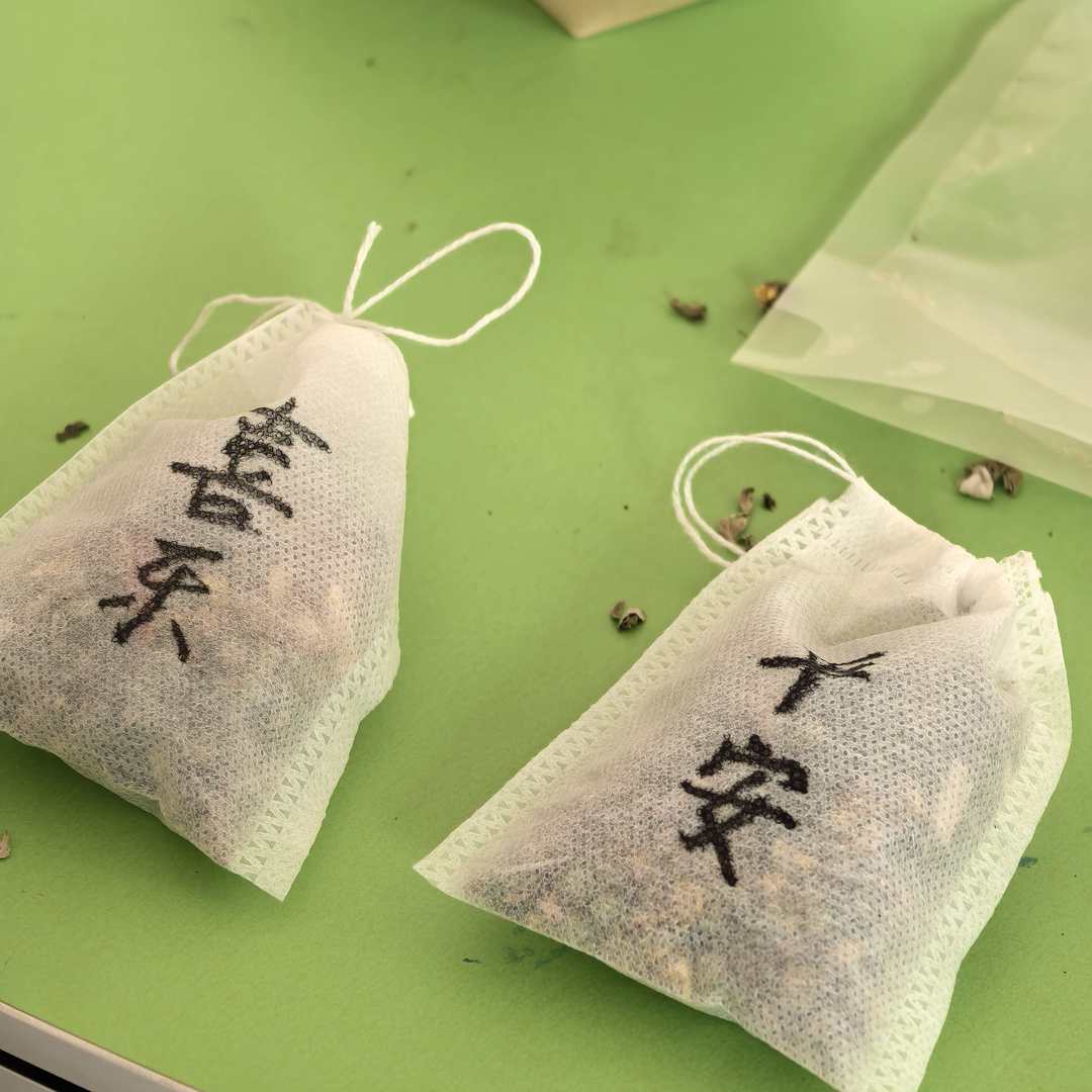 另一边的香囊制作活动,同样充满温情。活动前,工作人员精心筹备了丰富的物料:既准备了野菊花、艾草、橘皮、藿香等各式天然香料,清新香气弥漫;也准备了无纺布袋作为香囊主体,搭配马克笔、装饰卡片等工具,为创意发挥留足空间。