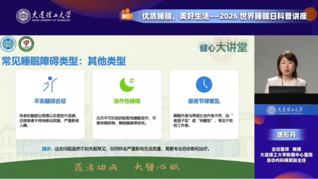 3月21日睡眠日当天,由中心联合医学部举办的“健心大讲堂”世界睡眠日健康科普讲座,邀请了大连理工大学附属中心医院唐彤丹教授,通过大连理工大学官方微信视频号、抖音和微博平台进行直播。讲座围绕世界睡眠日由来、睡眠重要性、睡眠现状、科学睡眠指南四方面展开。唐教授围绕“优质睡眠,美好生活”主题,阐释了睡眠在身体修复、大脑运作等方面的关键作用,结合权威数据说明我国睡眠问题高发态势,讲解常见睡眠障碍的表现与危害,还从睡眠环境、睡前习惯等多方面分享科学改善睡眠的方法。本次讲座有效提升了师生对睡眠健康的重视程度,为师生养成健康作息习惯提供了专业指导。三平台共有6.5万人次观看直播。