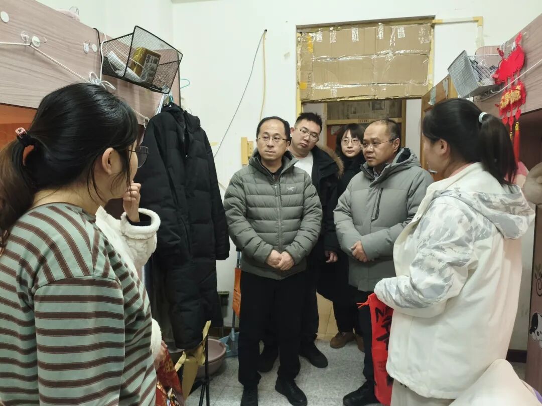 在弘基学生公寓,岳耀、孙闯与在连本科实习学生深入交流,就学生科室轮转体验、核心技能掌握情况、公寓冬季供暖和公共设施状况进行调研,了解大家在实习衔接、岗位适应、返乡购票等方面的实际需求。同时,反复叮嘱大家春节期间要时刻紧绷安全之弦,注意交通安全、公寓用电安全与个人健康防护,全力为同学们的平安过节保驾护航。
