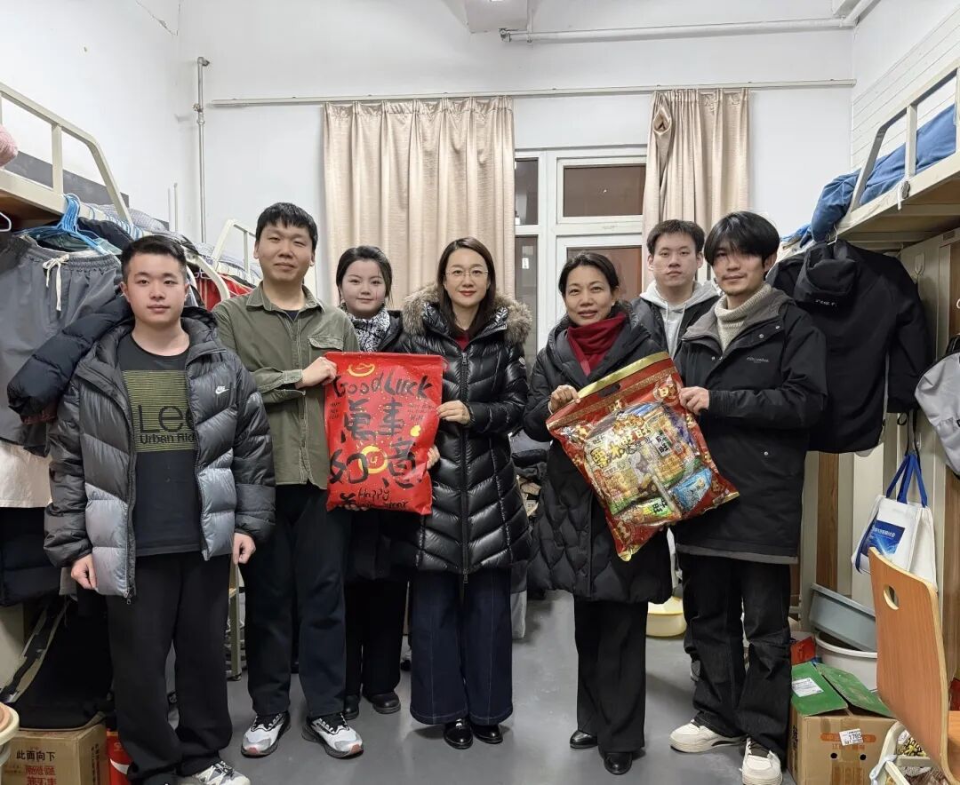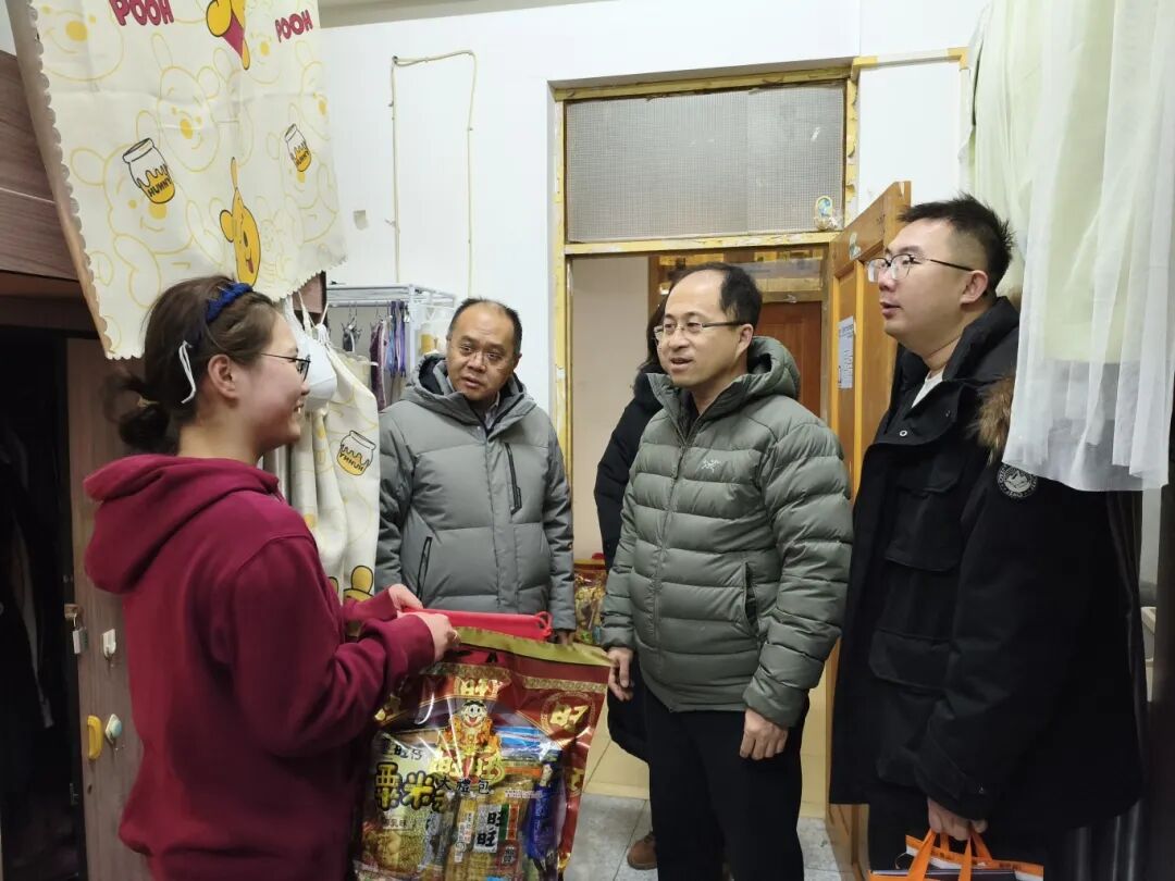 慰问现场暖意融融,学院领导、老师为每名同学送上了精心准备的新春礼包,让身处异乡的同学们深切感受到学院的浓浓温情,让影像留连学子们备受鼓舞与激励。