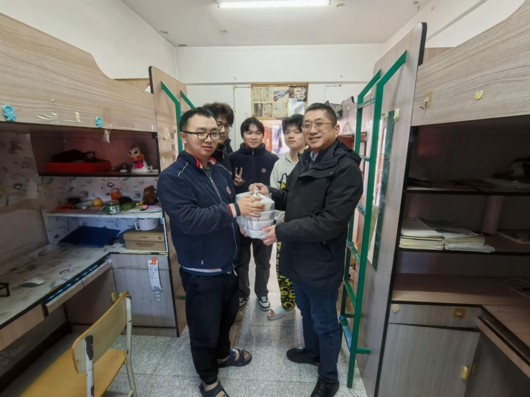 为了让远离家乡的学子们感受到家一般的温暖和浓浓的年味,除夕当天中午,检验医学院党总支书记吴斌与辅导员朱帅老师一同前往学生宿舍,看望慰问这七位留校过春节的实习生,为他们送去诚挚的新春祝福和热气腾腾的年夜饺子、精心准备的零食礼包。