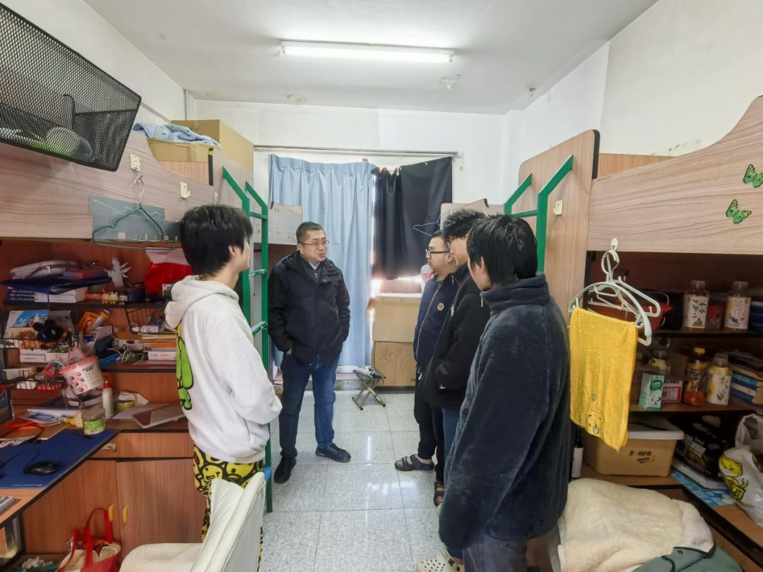 “同学们,过年好!”“家乡是哪里的?”“实习还顺利吗?”“年夜饭准备怎么吃?”一走进宿舍,吴斌书记就与同学们亲切交谈,详细询问大家的实习进展、生活保障以及假期安排。他仔细察看了宿舍的供暖、用水等设施,反复叮嘱同学们要注意假期安全,保持与家人和老师的联系,合理安排好假期生活,既要安心实习,也要好好休息,劳逸结合,度过一个平安、充实、愉快的春节。随后,吴斌书记和朱帅老师将还冒着热气的饺子和零食礼包送到同学们面前。这份特殊的年夜饭,不仅仅是一份食物,更是一份沉甸甸的关爱与牵挂。同学们围坐在一起,品尝着美味的饺子,脸上洋溢着幸福的笑容,宿舍里瞬间充满了“家”的味道和温馨。